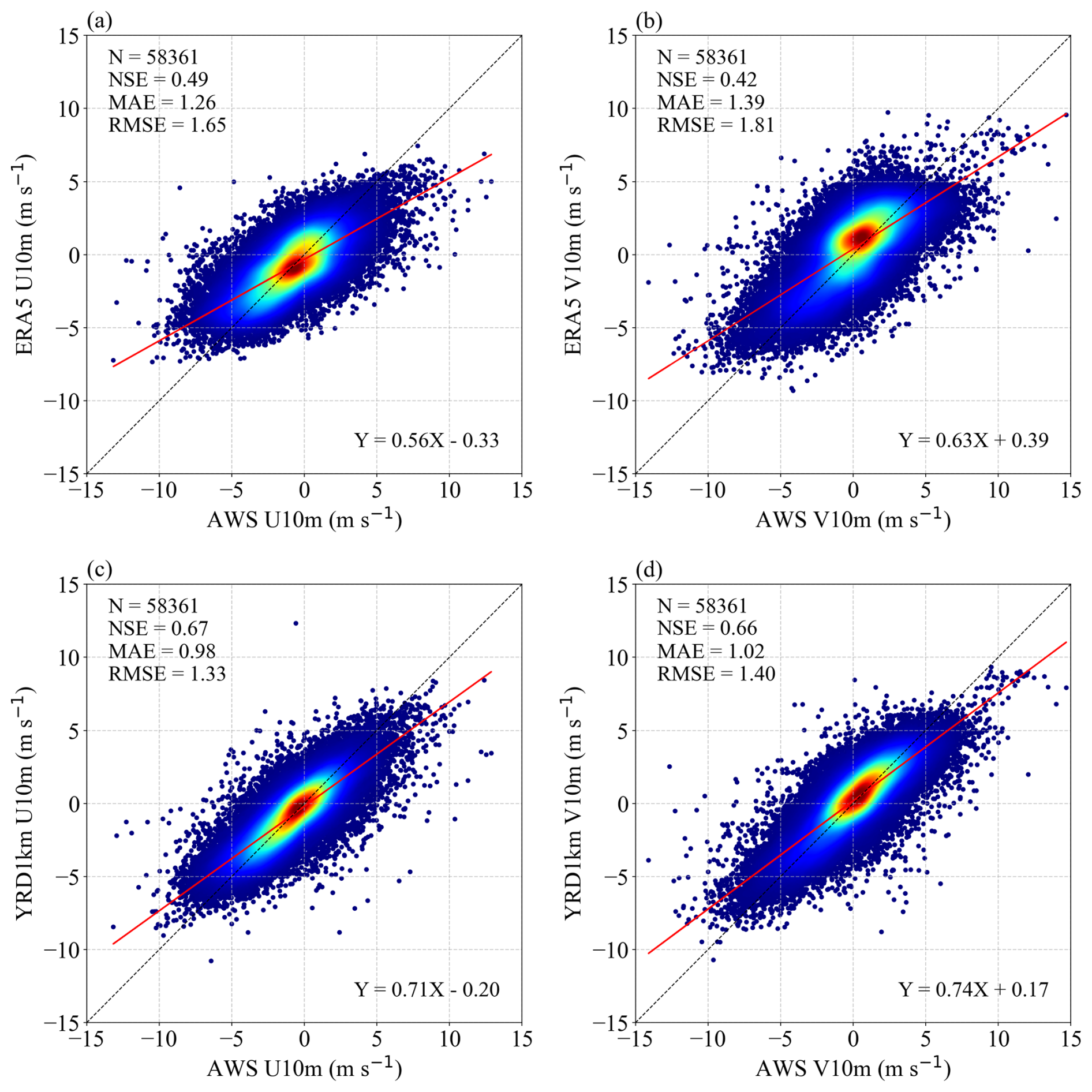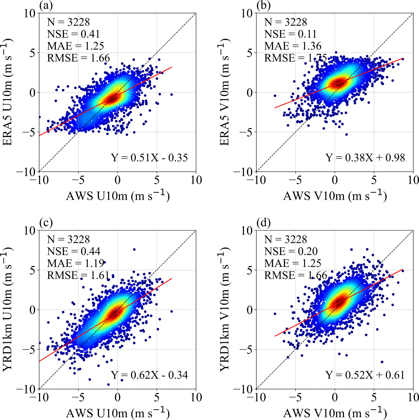 A comprehensive evaluation of near-surface wind field accuracy was conducted using AWS observations across the YRD region over a one-week period from 1 to 7 June 2022, serving as a representative example. Due to the different spatial resolutions of YRD1km and ERA5, a nearest-grid-point matching method was adopted for comparison with station observations (Liu et al., 2025). As shown in Fig. 3, scatterplots of the 10 m wind field U and V components for both ERA5 and YRD1km datasets were analyzed to assess their respective simulation capabilities. Overall, YRD1km exhibited superior performance in both U and V components, as evidenced by higher NSE coefficients, lower MAE and RMSE, and a tighter scatter distribution. Regression slopes for YRD1km were also notably closer to the 1:1 reference line, indicating a more accurate representation of the near-surface wind field compared to ERA5. For the U component (Fig. 3a, c), ERA5 presented an NSE of 0.49, with MAE and RMSE of 1.26 and 1.65 m s−1, respectively, and a regression slope of only 0.56, with increasing deviations under higher wind speed conditions. In contrast, YRD1km achieved a significant improvement with an NSE of 0.67, MAE reduced to 0.98 m s−1, RMSE reduced to 1.33 m s−1, and an increased regression slope of 0.71, significantly reducing systematic biases. Further analysis based on the sign of the U component revealed that ERA5 exhibited a consistent underestimation of both easterly winds (U<0) and westerly winds (U>0), particularly under stronger wind conditions ( m s−1). This finding aligns with previous reports by Hu et al. (2023). While YRD1km also exhibited a similar underestimation pattern, its magnitude was notably reduced, indicating an improved representation of directional wind components compared to ERA5. Additionally, as wind speed increased, scatter dispersion became more pronounced, with fewer samples in the high wind speed range, adding challenges to accurate simulation.