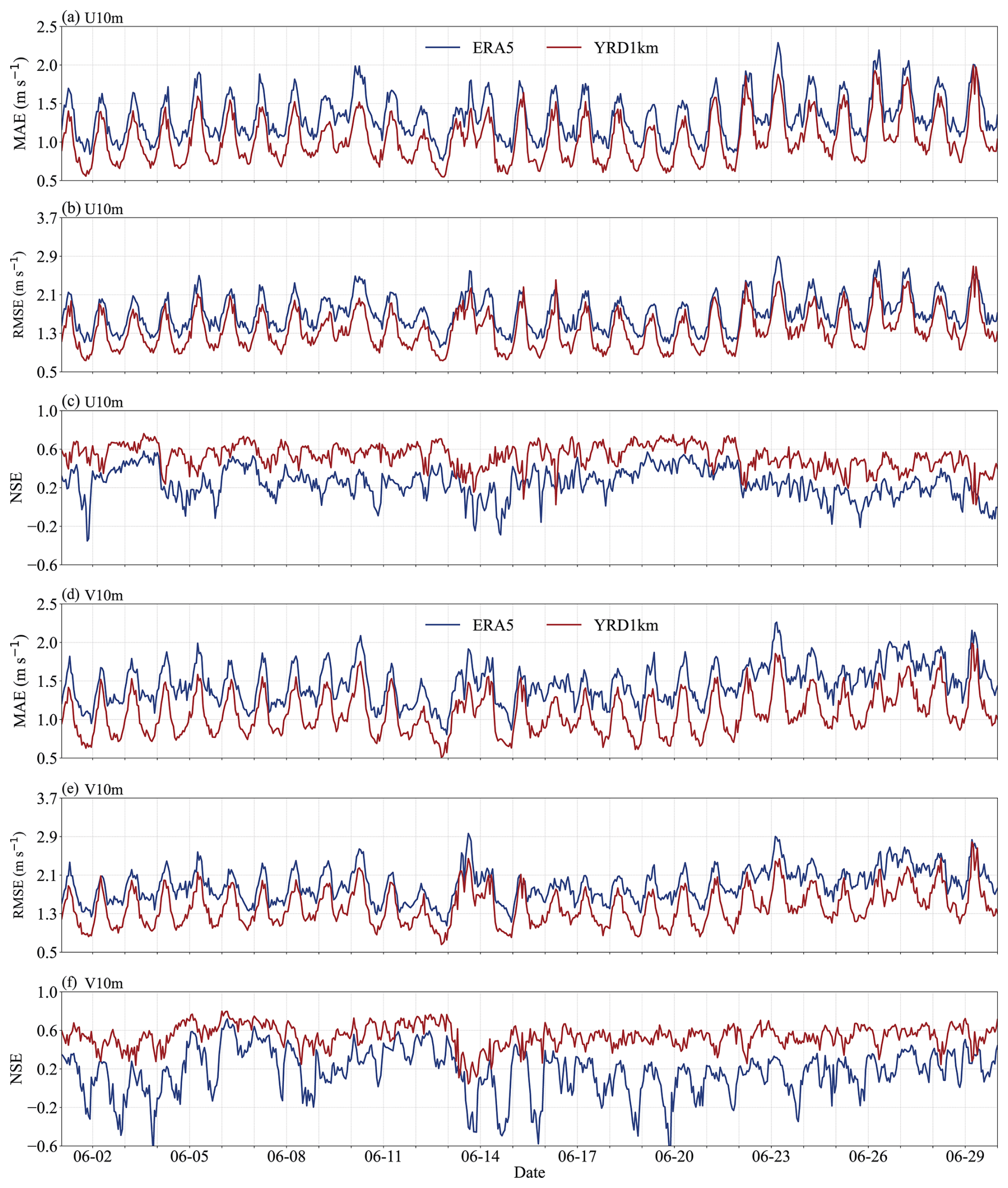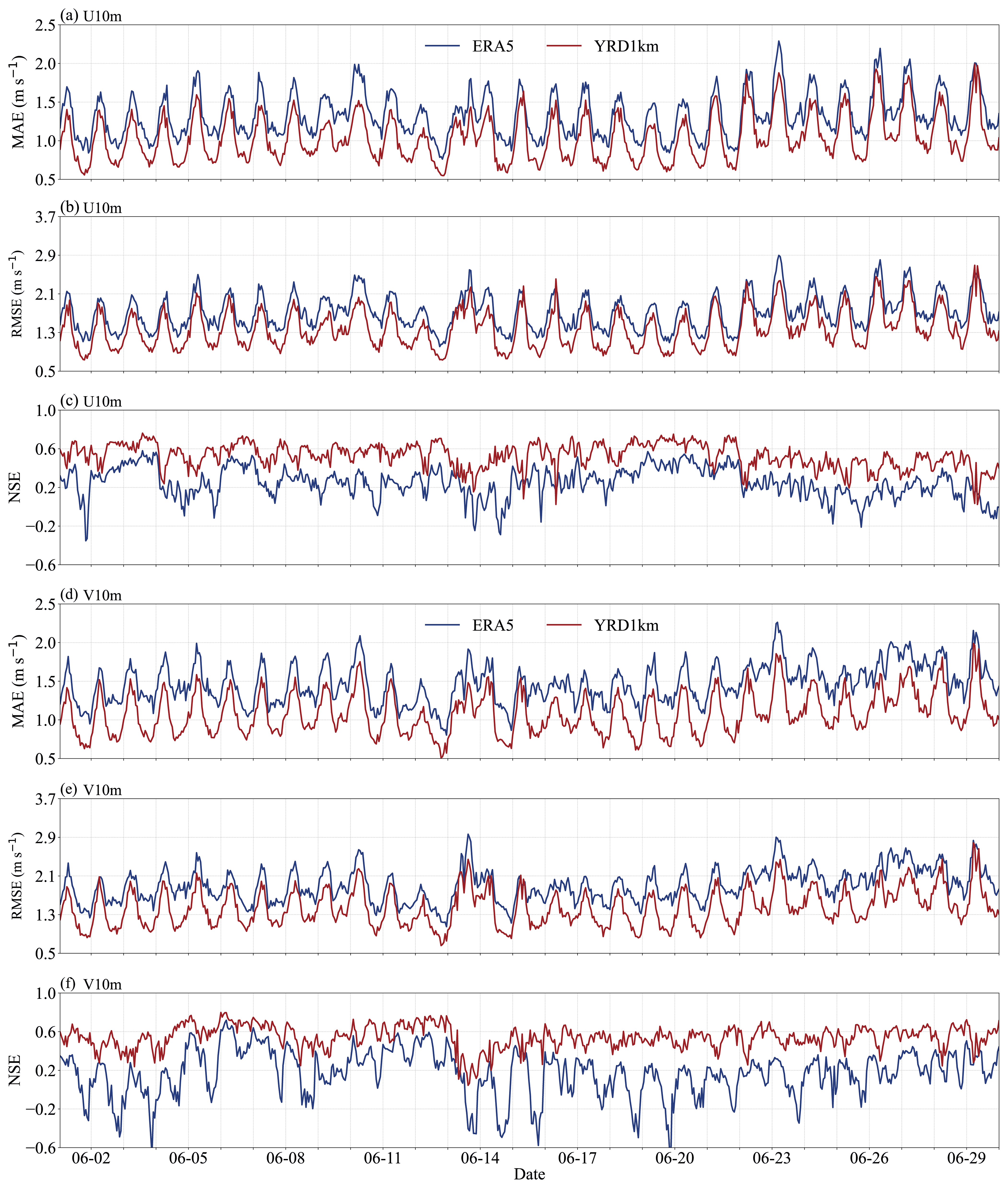 Figure 6Time series of model performance metrics for hourly 10 m wind components over the YRD region in June 2022. Panels (a), (b) and (c) show the MAE, RMSE and NSE, respectively, for the U10m. Panels (d), (e) and (f) show the corresponding MAE, RMSE and NSE metrics for the V10m. All metrics are computed for each hour by spatially averaging errors over all available surface stations across the YRD region. The red and blue lines represent the YRD1km and ERA5 datasets, respectively.