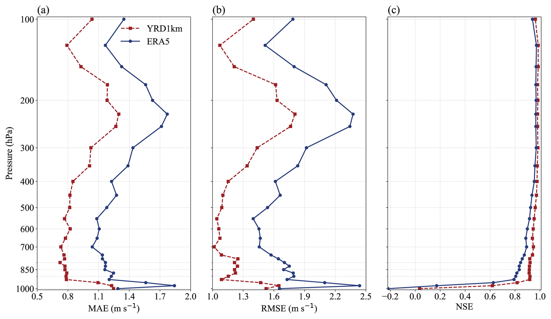 Figure 8Vertical evaluation of wind field performance from the YRD1km and ERA5 datasets against radiosonde observations at 11 stations across the Yangtze River Delta in June 2022. Panels show (a) MAE, (b) RMSE and (c) NSE, computed using all available 00:00 and 12:00 UTC soundings.