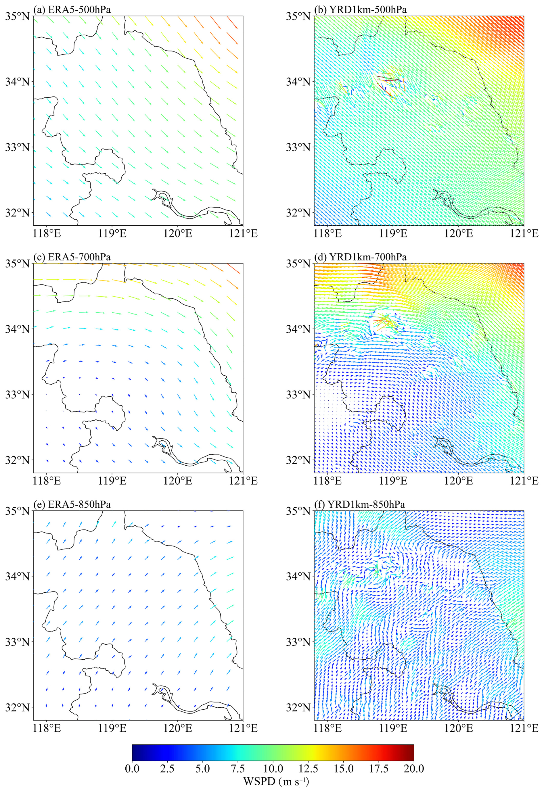Figure 10Comparative analysis of wind field structures between the YRD1km and ERA5 datasets during the short-duration severe convective event over Yancheng, Jiangsu Province. Displayed are horizontal wind vectors (arrows) and wind speed (color shading) at the (a, b) 500 hPa, (c, d) 700 hPa, and (e, f) 850 hPa levels from ERA5 (left column) and YRD1km (right column) at 08:00 UTC on 16 June 2022. For visual clarity, YRD1km wind vectors have been thinned by a factor of six.