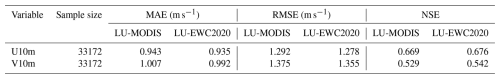 To quantify land use update effects on wind field simulations, we conduct two experiments under the ON + AN assimilation framework: (1) LU-MODIS: Retains default MODIS-based land use types; (2) LU-EWC2020: Incorporates the refined EWC2020-derived surface parameters. Using the four-day case study, validation metrics (Table 2) demonstrate small but obvious positive impacts across all metrics for the LU-EWC2020 experiment compared to LU-MODIS. These results confirm the value of high-resolution land use updates in resolving urbanization-induced land-atmosphere interactions.