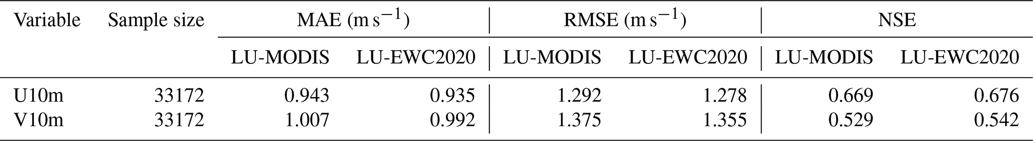 Conventional land use datasets in WRF (USGS 1992–1993 or MODIS 2001) (Anderson et al., 1976) are limited in their ability to reflect the rapid urban expansion and evolving land surface characteristics of the YRD region. To address this, we integrate the EWC2020 dataset – a global land cover product with 10 m spatial resolution that classifies 11 surface types (e.g., built-up areas, croplands, water bodies) (https://esa-worldcover.org/en, last access: 6 March 2025). By updating WRF's land surface parameters with EWC2020, we refine the representation of aerodynamic roughness lengths and urban heat island effects. For instance, reclassifying Shanghai's Pudong district from Moderate Resolution Imaging Spectroradiometer (MODIS) “mixed urban” to EWC2020 “high-intensity built-up” improves wind field simulations by better capturing drag effects from high-rise structures, as validated against AWS observations.