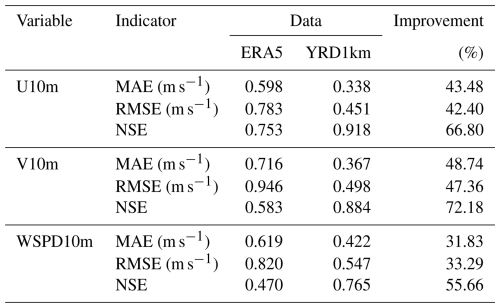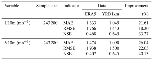 The independent validation was conducted over a continuous four-day period from 1 to 4 June 2022, allowing the evaluation to sample a range of synoptic and mesoscale meteorological conditions. Validation against observations at these withheld stations shows that the YRD1km dataset exhibits improved performance relative to ERA5 in simulating near-surface wind fields. For the U component, NSE increases by 5.08 %, MAE decreases by 4.80 %, and RMSE decreases by 3.01 % relative to ERA5. For the V component, NSE increases by 10.11 %, while MAE and RMSE decrease by 8.09 % and 5.14 %, respectively. In addition, the fitted relationships between simulated and observed U and V components shifted closer to the 1:1 line, indicating enhanced fidelity in reproducing near-surface wind variability (Fig. 4). These results indicate that the performance gains in YRD1km are not limited to assimilated locations. Instead, the improvements extend spatially, demonstrating that the combination of dynamical downscaling, high-resolution land-surface updates, and the hybrid ON + AN nudging framework enhances the regional wind field representation in a physically coherent manner.