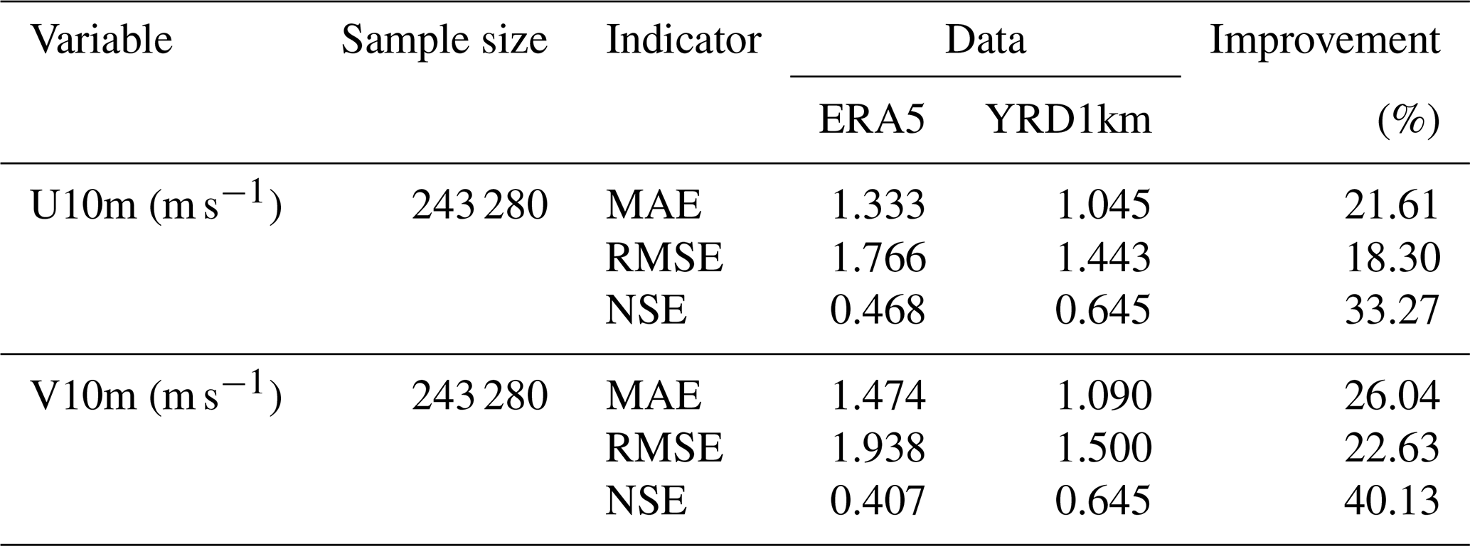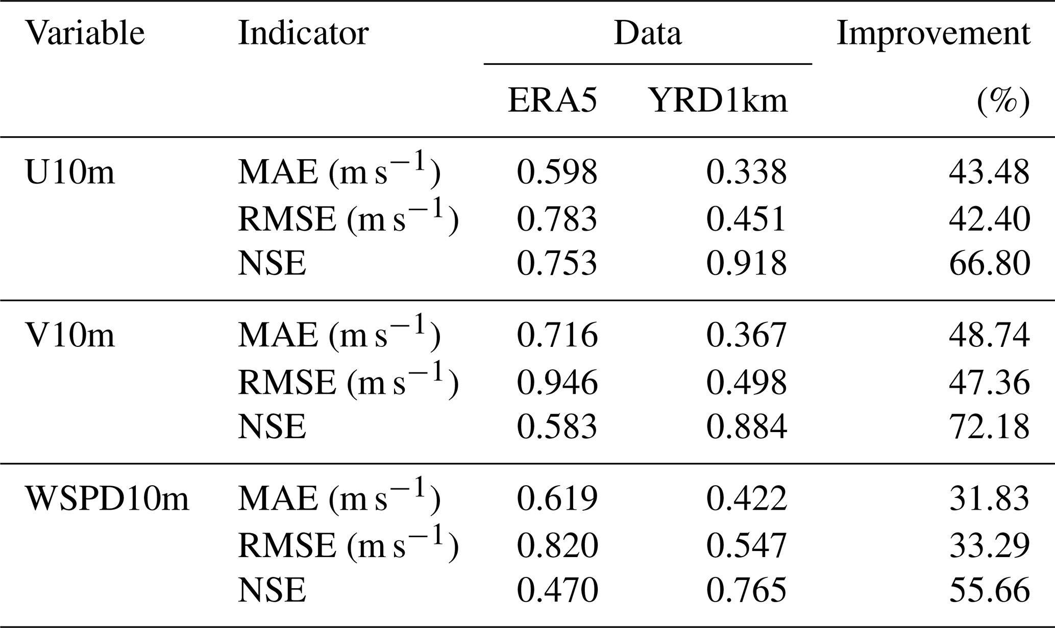 Results in Fig. 3 are based on hourly data. Considering that climate research emphasizes the use of daily data to smooth short-term fluctuations and reveal long-term trends (Kotlarski et al., 2019; Nashwan et al., 2019; Zhang et al., 2024), this study further examined the simulation accuracy of 10 m wind filed at the daily mean scale. Based on daily mean observations from more than 300 AWS stations across the YRD region over a continuous seven-day period from 1 to 7 June 2022 (Table 3), the comparison results demonstrate that YRD1km maintains a consistent accuracy advantage over ERA5 for all evaluated metrics, including the U and V wind components as well as 10 m wind speed. Notably, the daily mean values of the U and V components exhibited better statistical performance than their hourly counterparts, as temporal averaging effectively mitigates short-term fluctuations and random errors, enhancing simulation stability. Additionally, compared to 10 m wind speed (WSPD10m), the U and V components demonstrated greater improvements in error metrics, with NSE values closer to 1. This is primarily because wind speed is a scalar variable, while U and V components are vectors accounting for wind direction errors.