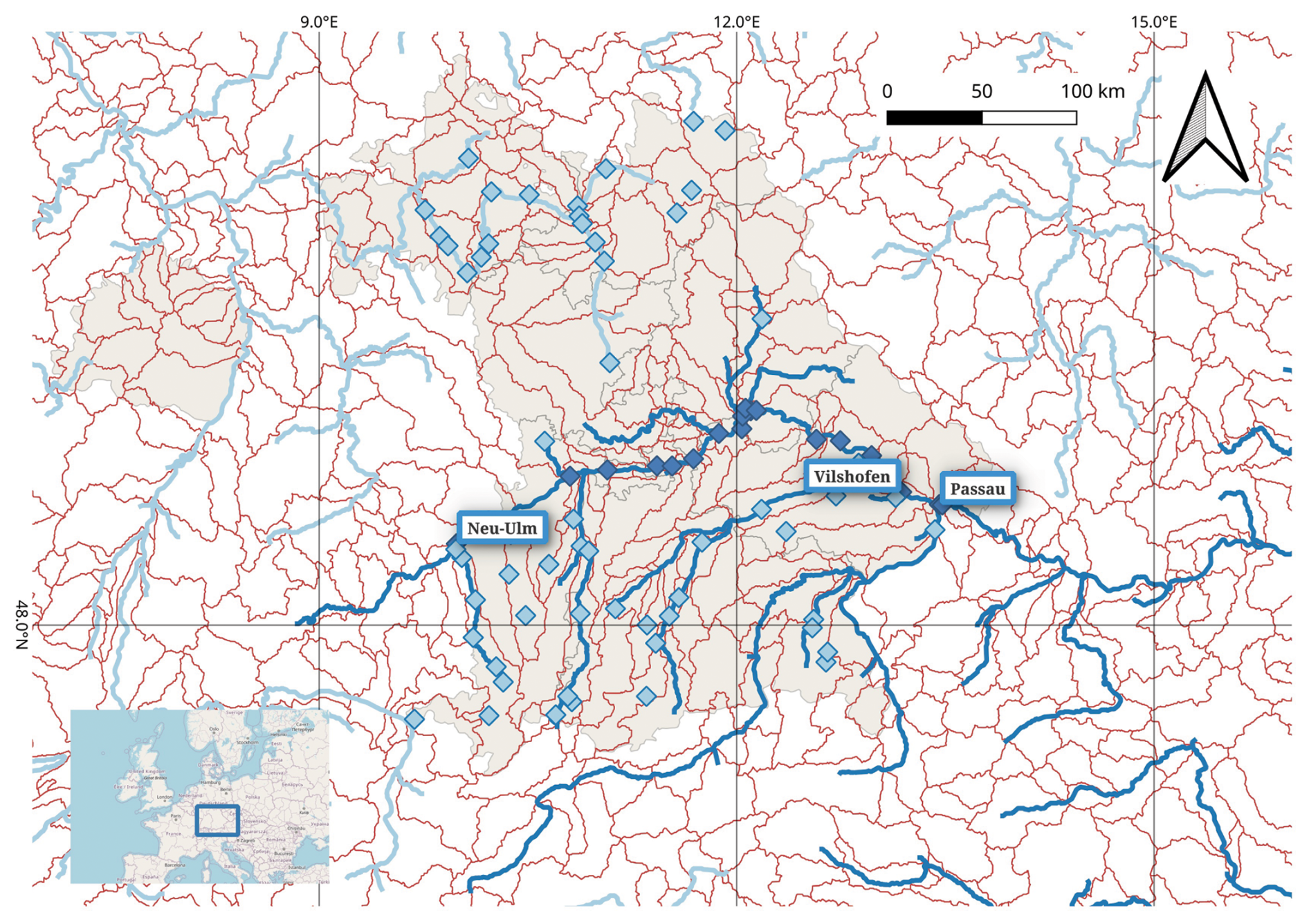 Figure 2Kingdom of Bavaria in its administrative borders from 1845 (grey underlay). Danube and its tributaries (dark blue), other main rivers (light blue). HydroBasins Level 7 (red). Gauge stations for which level recordings are reported: along the Danube (dark blue) and other rivers (light blue). Gauges stations for this study (highlighted). Sources: Bayerisches Hauptstaatsarchiv, HGIS Germany, OpenStreetMap (© OpenStreetMap contributors, HydroBasins, AQUASTAT (FAO).