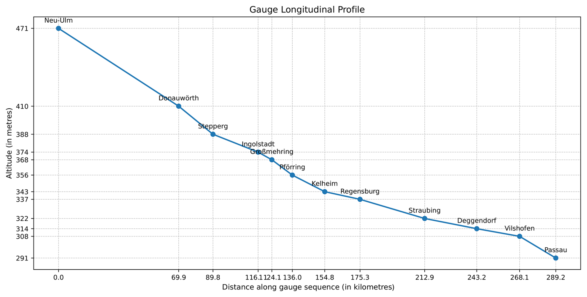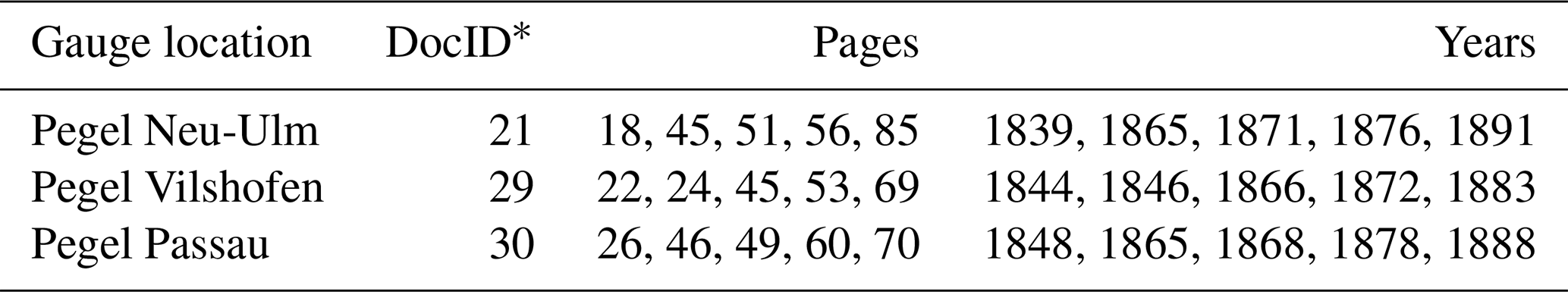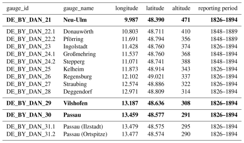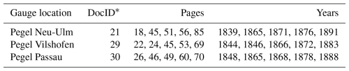 Table 1Nineteenth-century Bavarian Danube gauges in the archive; case-study gauges highlighted in bold font. Six Danube gauges from a later period are not listed here. Source: Bayerisches Hauptstaatsarchiv II 2.11.2.1.3 Landesamt für Wasserwirtschaft 1.2.1 Pegel an der Donau. The last two digits from gauge_id (21–31) are to be added to the call number for accessing the primary sources in the reading room of the archive.