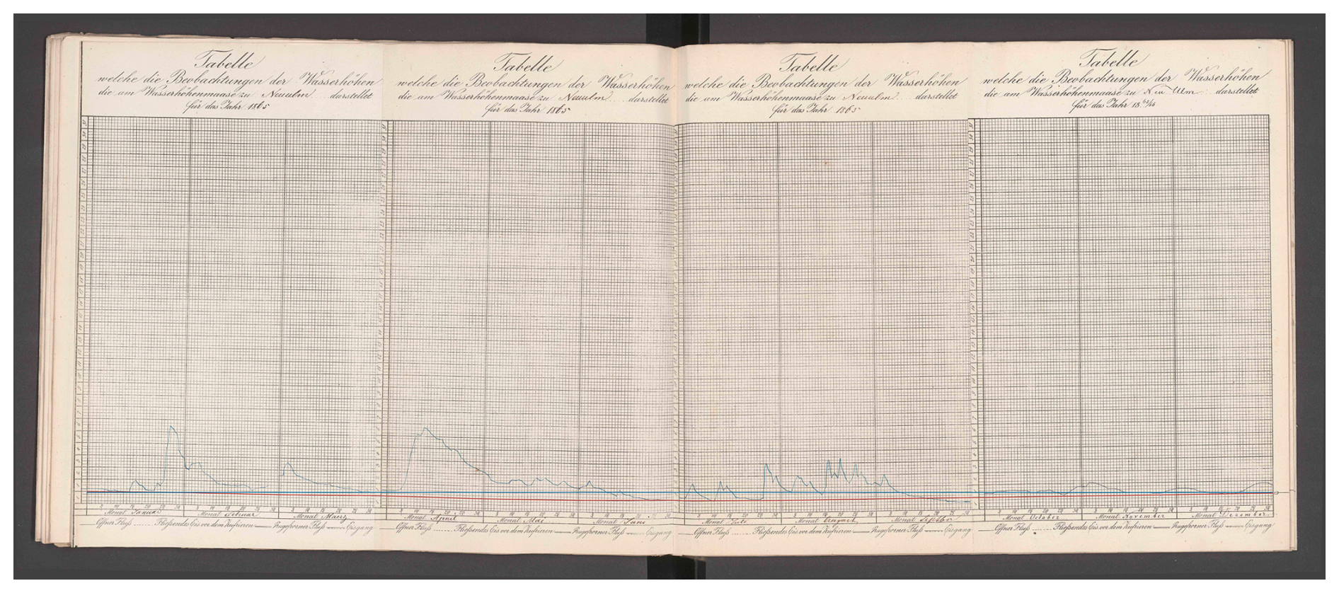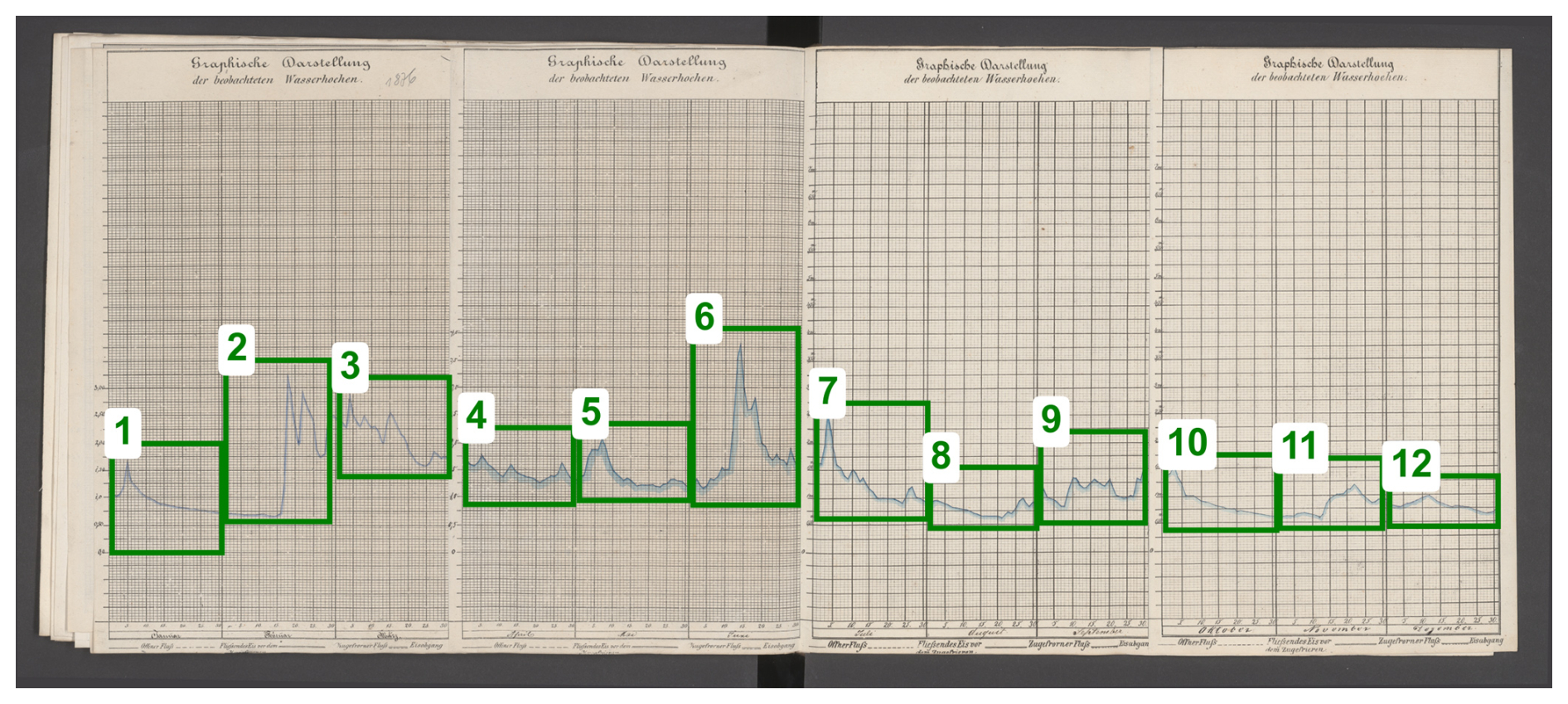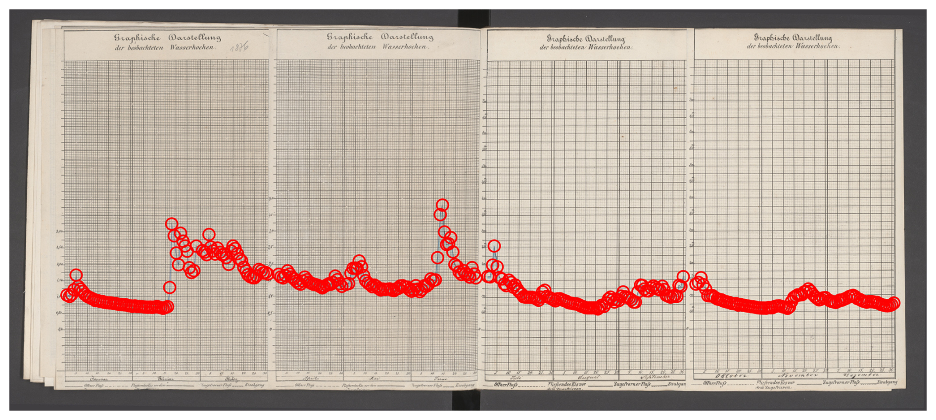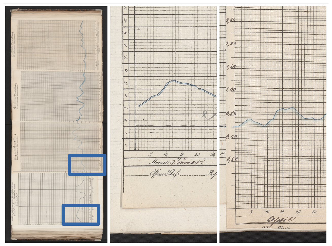 Provenance and format. The primary sources are archival river-gauge charts compiled by the Bayerisches Landesamt für Wasserwirtschaft (BLW) and today preserved in the Bayerisches Hauptstaatsarchiv (BayHStA) (Munich) under the call number (archival signature) BayHStA II 2.11.2.1.3 Landesamt für Wasserwirtschaft 1.2.1 Pegel an der Donau. The record extends back to the early nineteenth century and consists of a continuous, regionally extensive series of hand-drawn hydrographs on pre-printed forms. Each standard form (approx. 20 × 34 cm) covers one quarter (three months) with a daily grid, a vertical scale and unit annotations; a hand-drawn curve traces the water level at daily resolution. Four quarterly forms were glued edge-to-edge to create a single annual sheet, typically annotated with units, vertical ticks, and occasional later corrections. Series of annual sheets for a given gauge were then bound into volumes; some sheets carry additional notes on the reverse.