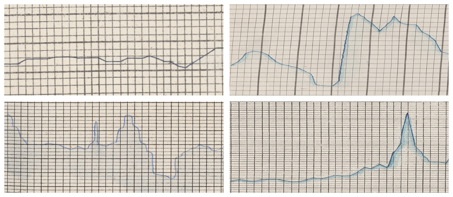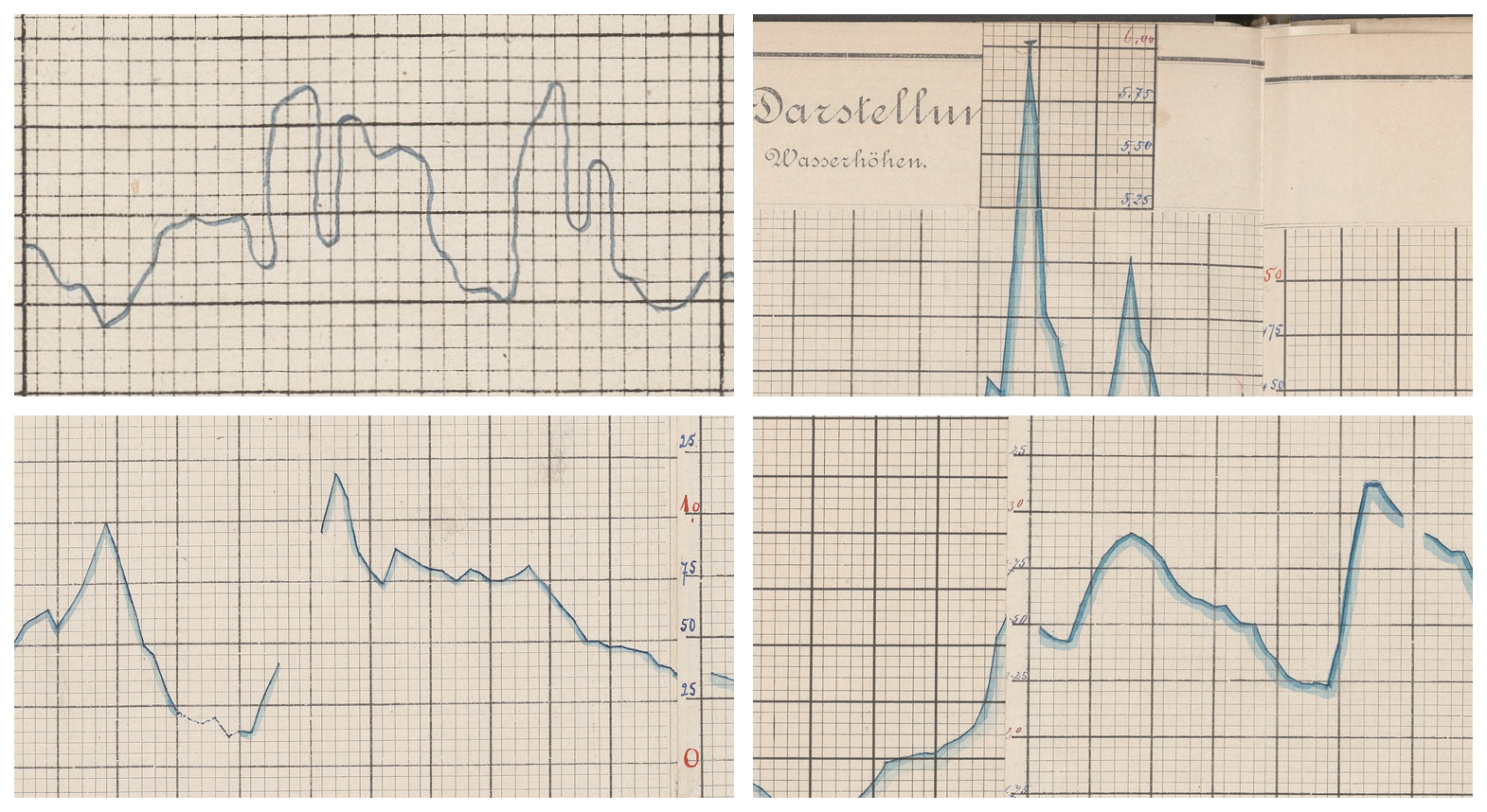 Figure 5Samples illustrating some types of anomalies in line chart drawing often found in the sources. The selection also illustrates some of the different drawing styles. Top left: some creativity employed in this sample with the curve even going backwards (Neu-Ulm, 1826); top right: extra paper added for covering high flood (Passau, 1892); bottom left: non-continuous line between months February and March (Vilshofen, 1894); bottom-right: misaligned gluing of quarterly forms (Passau, 1892). Image sources: BayHStA BLW 21, 29, 30.