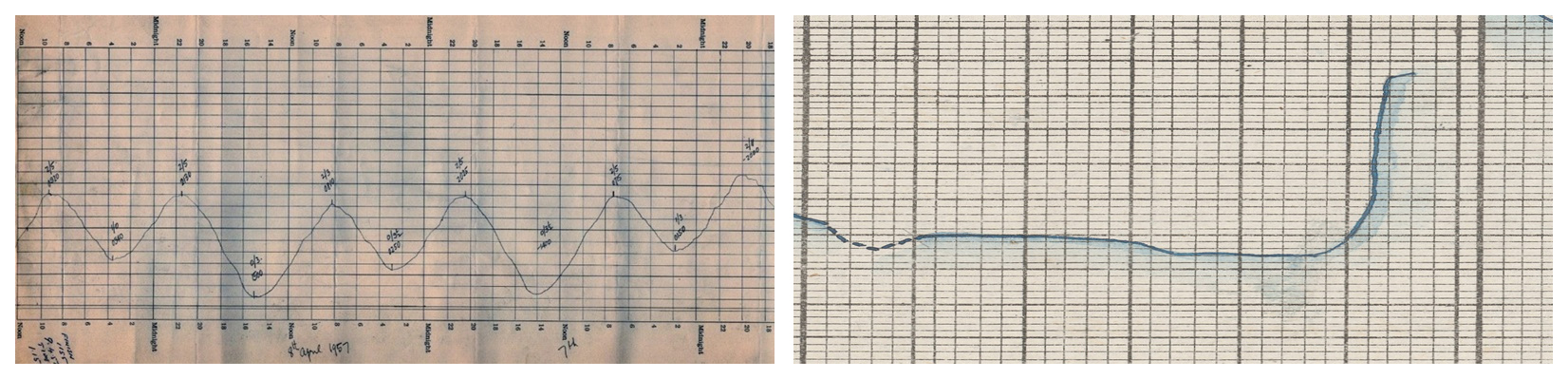 Figure 6Juxta-position of a typical tidal sea level record (marigram) and a particularly flat period of a river water level. Left: Williamstown (Australia) tide data (1875–1965, here: 1957) illustrating typical periodicity. Source: Mcrae (2018); right: sample of a panel in river gauge level (Neu-Ulm, February 1873). Image source: BayHStA BLW 21.