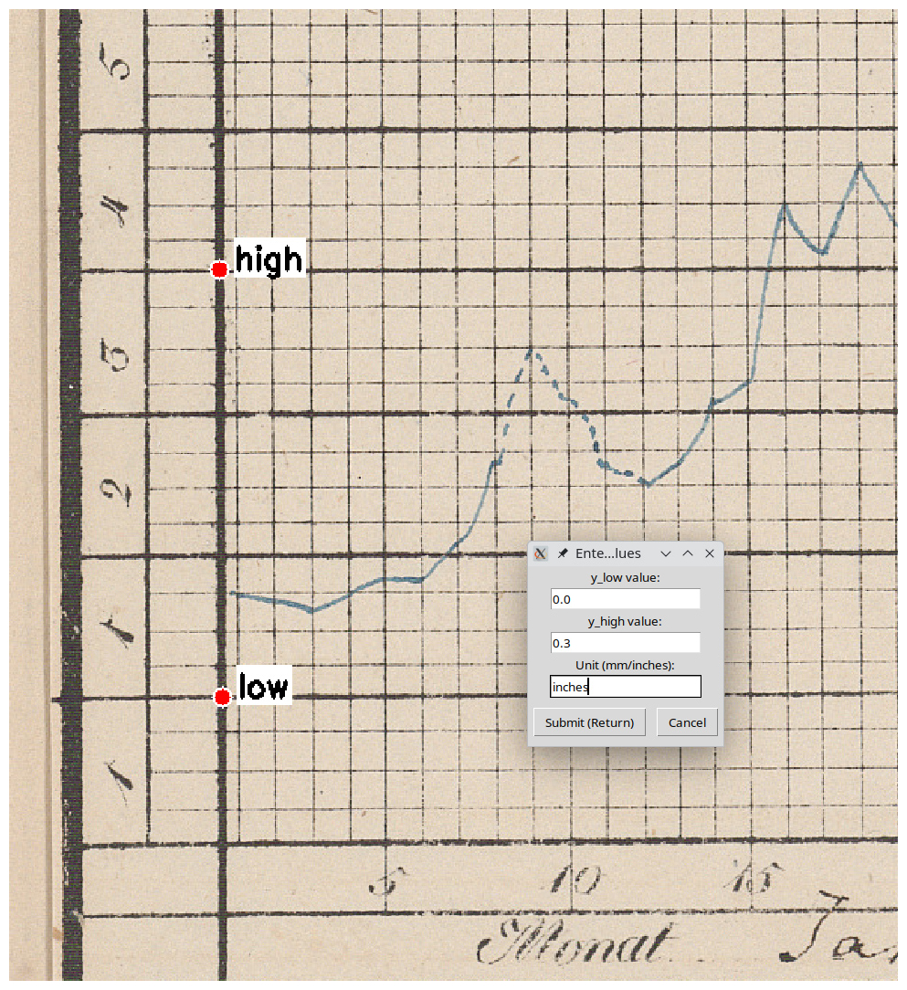 Across disciplines, the essential steps, whether conducted consecutively or in one go, are similar: (1) figure parsing (panel segmentation, axes and grid localisation), (2) coordinate system recovery (mapping pixels to physical units under a declared datum/zero), (3) trace extraction (identifying and vectorising the plotted curve), and (4) transform vectors into data using the coordinate system. Each step interacts with documentary conventions: changing templates, variable grid spacing, marginal notes, and later corrections. For hydrometric charts, the additional requirement is datum consistency across months/years (gauge zero, units), so that reconstructed series can be compared across time. Community practices in sea-level work (e.g., revised local reference schemes) illustrate the importance of such cross-record unification.