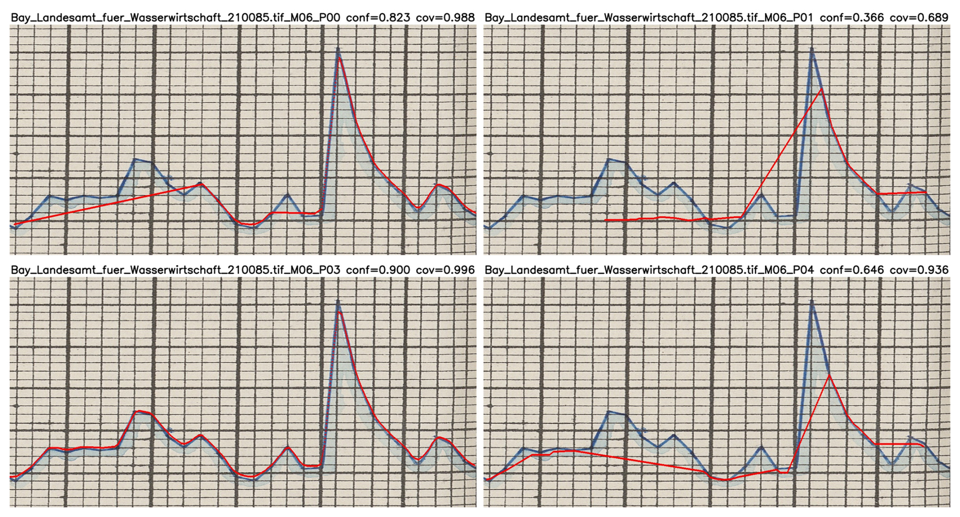 River charts and tide charts present different signal and layout regimes. River hydrographs emphasise seasonal cycles and episodic floods, often with long panels and coarser vertical ticks; tide charts exhibit strong semidiurnal/diurnal periodicity and denser vertical scaling (Latapy et al., 2023; Talke et al., 2020). In both cases, page artefacts (paper warp, spine curvature, quarter-join offsets), heterogeneous inks, and template revisions complicate automated extraction. The common core is a single, continuous hand-drawn line that must be followed through noise, gaps, and overprinted, written, or drawn annotations, but especially the panels/plateaus as visualised here caused additional challenges in differentiating them from the underlying grid (Fig. 6).