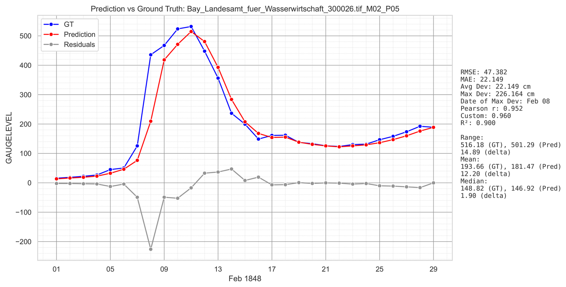 This section specifies how we quantify the accuracy of reconstructed daily gauge levels. Our choices are shaped by two constraints of the corpus: (i) evaluation is conducted per month (the operational unit for extraction and quality control), and (ii) we do not rely on pixel-level ground truth polylines for accuracy; instead, we evaluate against ground truth in original physical units. Consequently, curve-space distances (e.g., Hausdorff/Fréchet) are not used as headline measures. We do, however, report a panel of series-level metrics – RMSE, MAE (average deviation), maximum absolute deviation, Pearson_r, and an adopted peak-aware composite score as our primary objective for decisions in the pilot study (parameter selection) and subsequent evaluations.