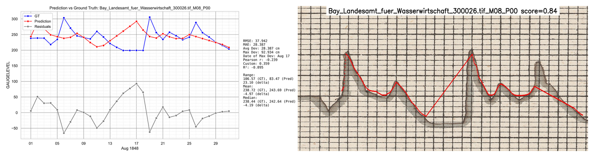 Hydrological use cases may care about physical levels and timing at daily resolution (flood peaks, seasonal lows). Series-level metrics in original physical units directly reflect those targets and are robust to purely graphical idiosyncrasies (ink density, micro-warp) that do not affect the numerical series. Pixel-space curve distances would require an additional layer of ground truth and can over-emphasise small geometric deviations that have negligible effect after conversion to levels. For this reason we (i) evaluate in level space, and (ii) reserve pixel-space diagnostics (continuity/fragmentation, edge hits) for internal quality control (by visual inspection, especially in candidate selection) rather than accuracy reporting.