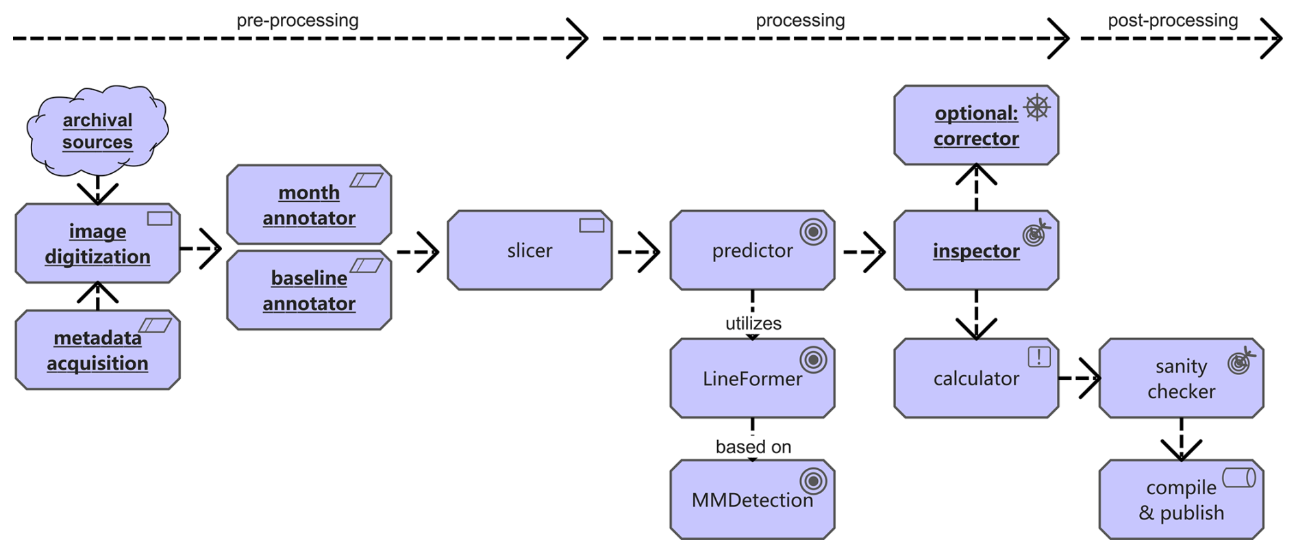Paper bulging from book spines and scanning skew introduce systematic geometric error that propagates to level estimates. Learning-based document dewarping – DocUNet and DewarpNet – predicts pixel-wise forward mappings from warped to flat coordinates, offering a principled pre-processing step before line extraction (Das et al., 2019). In our context, mild, grid-aware dewarping combined with per-month anchor calibration (Sect. 4.5.3) reduces day-shift and vertical bias.