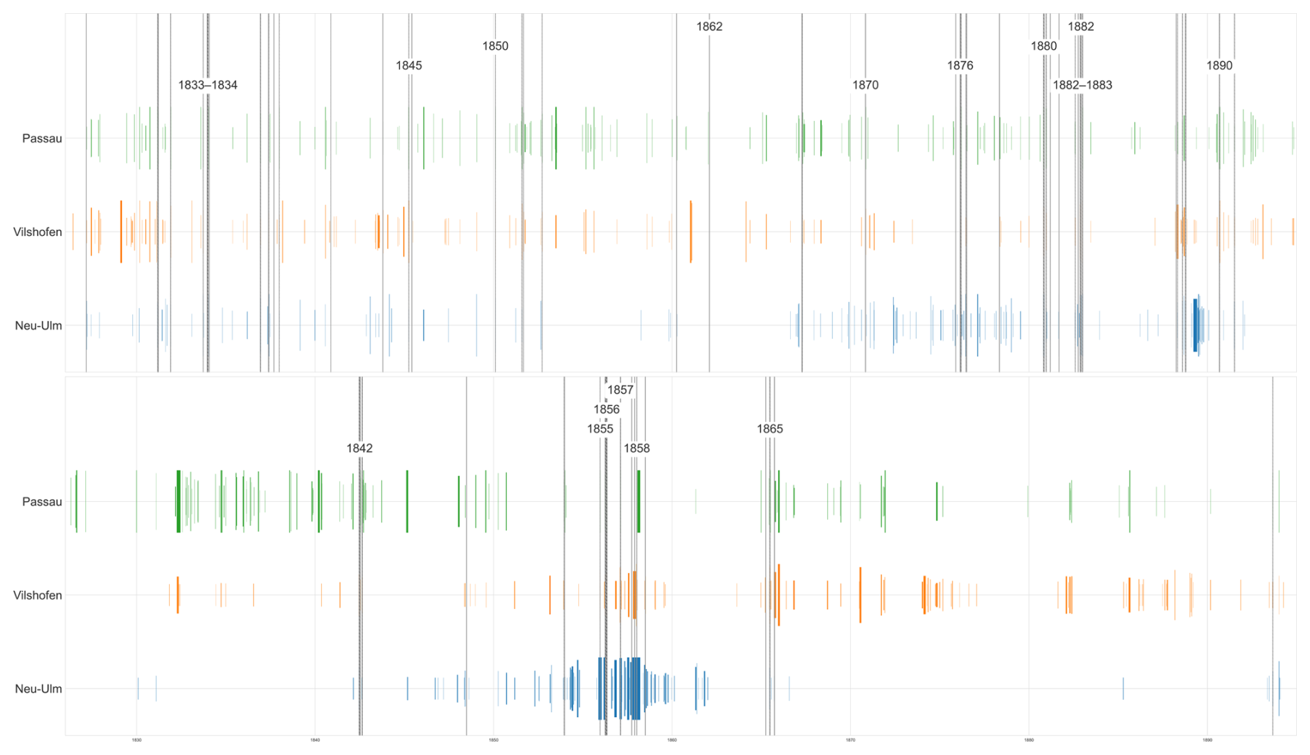 Compilation practice. Visual inspection shows that the annual sheets were not updated day-by-day but compiled retrospectively, possibly on a quarterly cadence. This implies the existence of primary daybooks or tabular ledgers from which the quarterly charts were prepared. For the Bavarian Danube, such underlying tabular sources have not been located to date; consequently, the bound charts constitute the most complete surviving record for the nineteenth century.