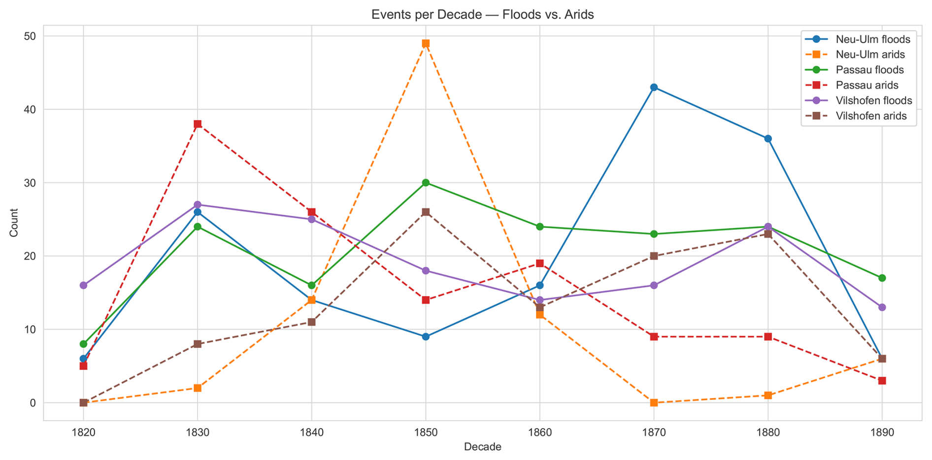Rehbein, M.: Bavarian Danube Water Level Reconstruction (1826–1894), Zenodo [data set], https://doi.org/10.5281/zenodo.17296750, 2025. a, b, c, d