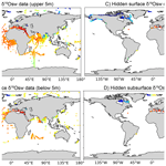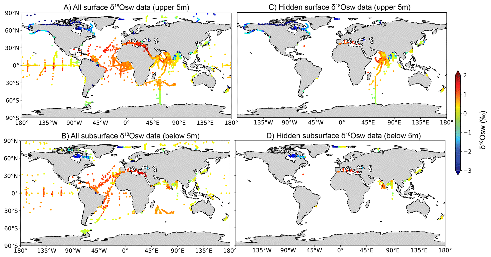 Figure 1Locations and seawater δ18O values of data in the database: (A) all surface ocean data (upper 5 m of the water column), (B) all subsurface ocean data (below 5 m), (C) the hidden surface ocean data only (upper 5 m), (D) the hidden subsurface ocean data only (below 5 m).