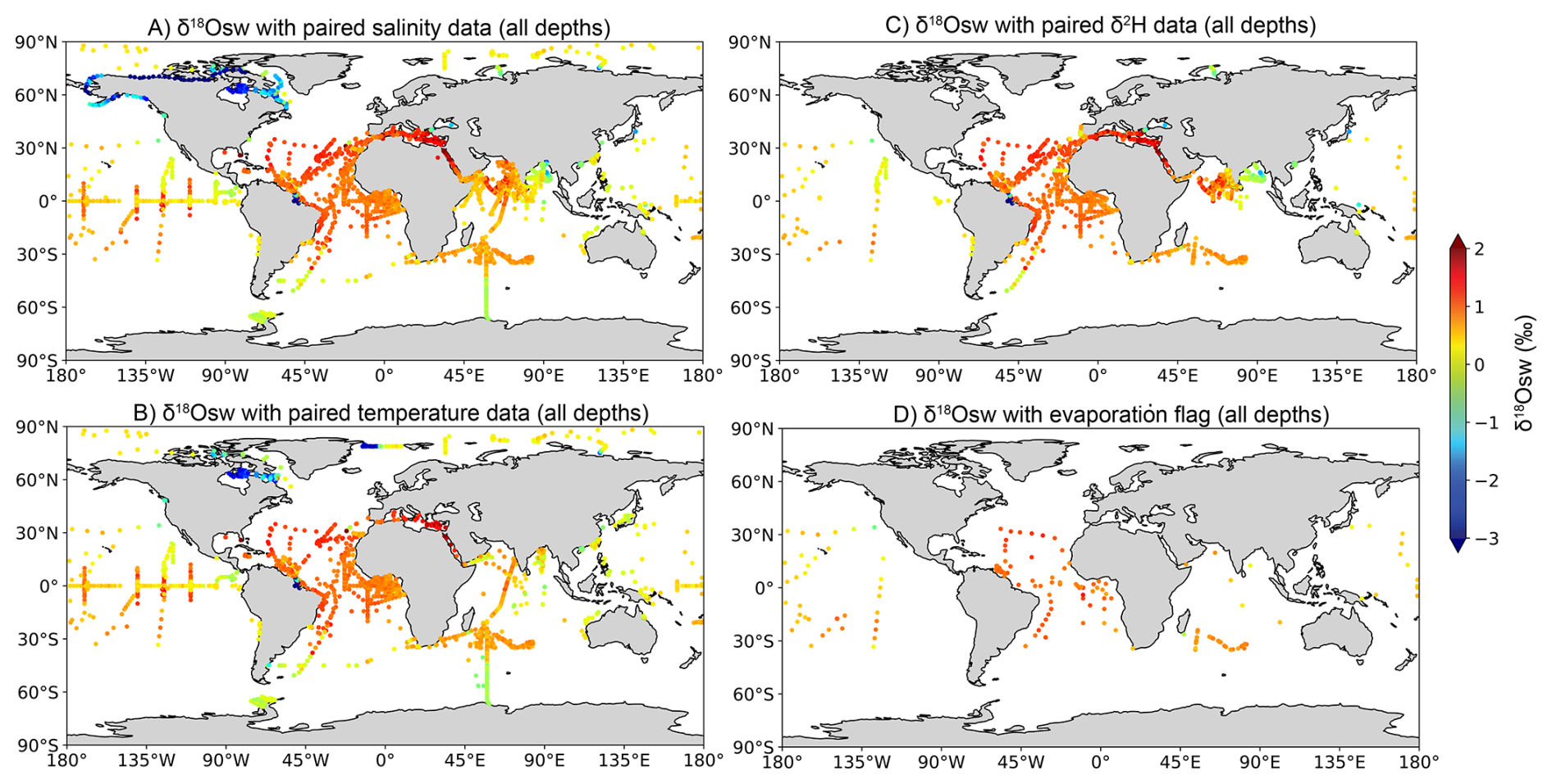 Figure 3Locations and seawater δ18O values of the data in the database with (A) paired salinity measurements, (B) paired temperature measurements, (C) paired δ2H measurements, and (D) an evaporation flag.