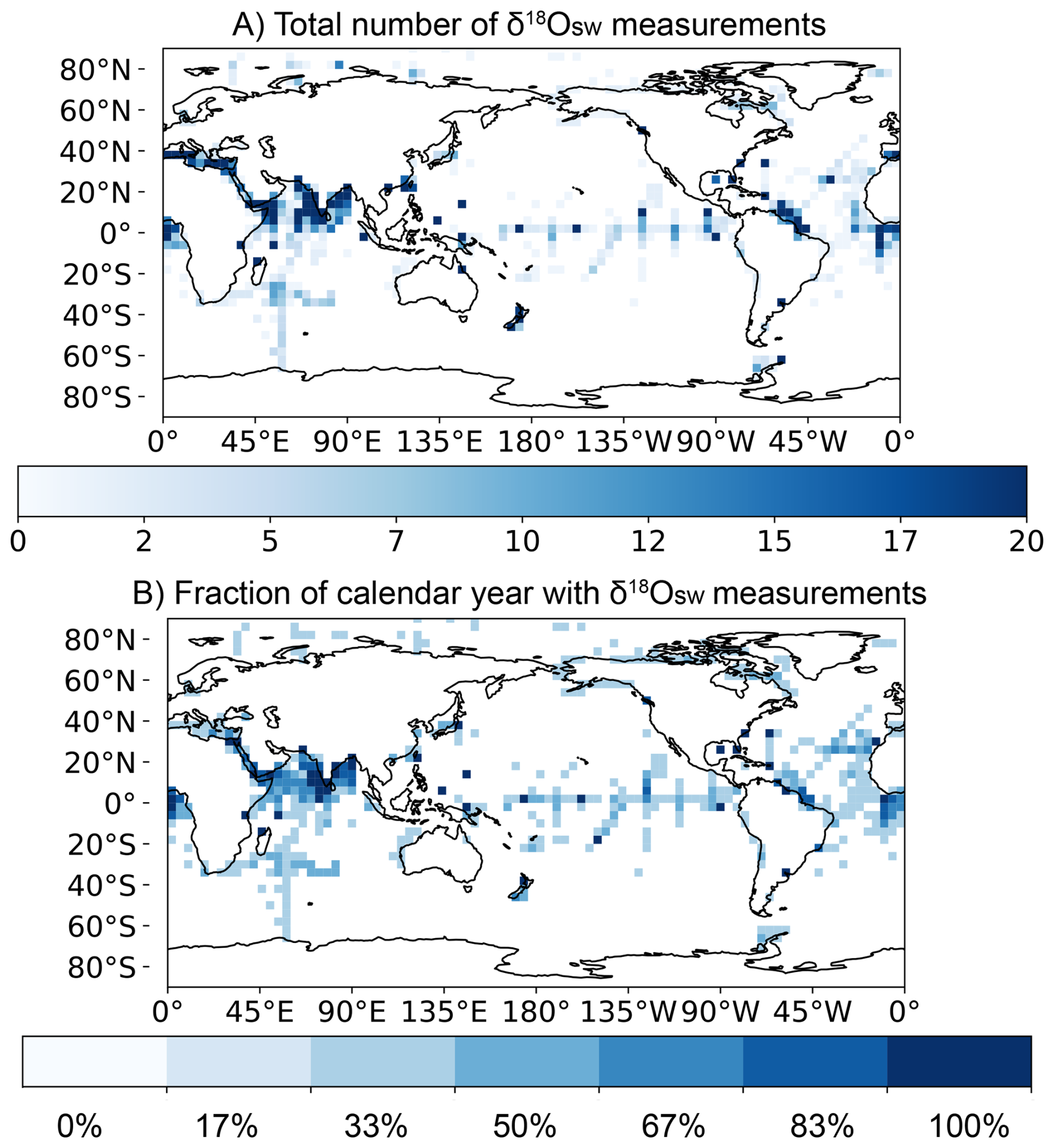 Figure 4Temporal distribution of near-surface (upper 5 m) δ18Osw measurements in the database, aggregated in 2° × 2° (latitude × longitude) grid boxes. (A) Total number of δ18Osw measurements in each grid box. (B) Fraction of calendar year with δ18Osw measurements.