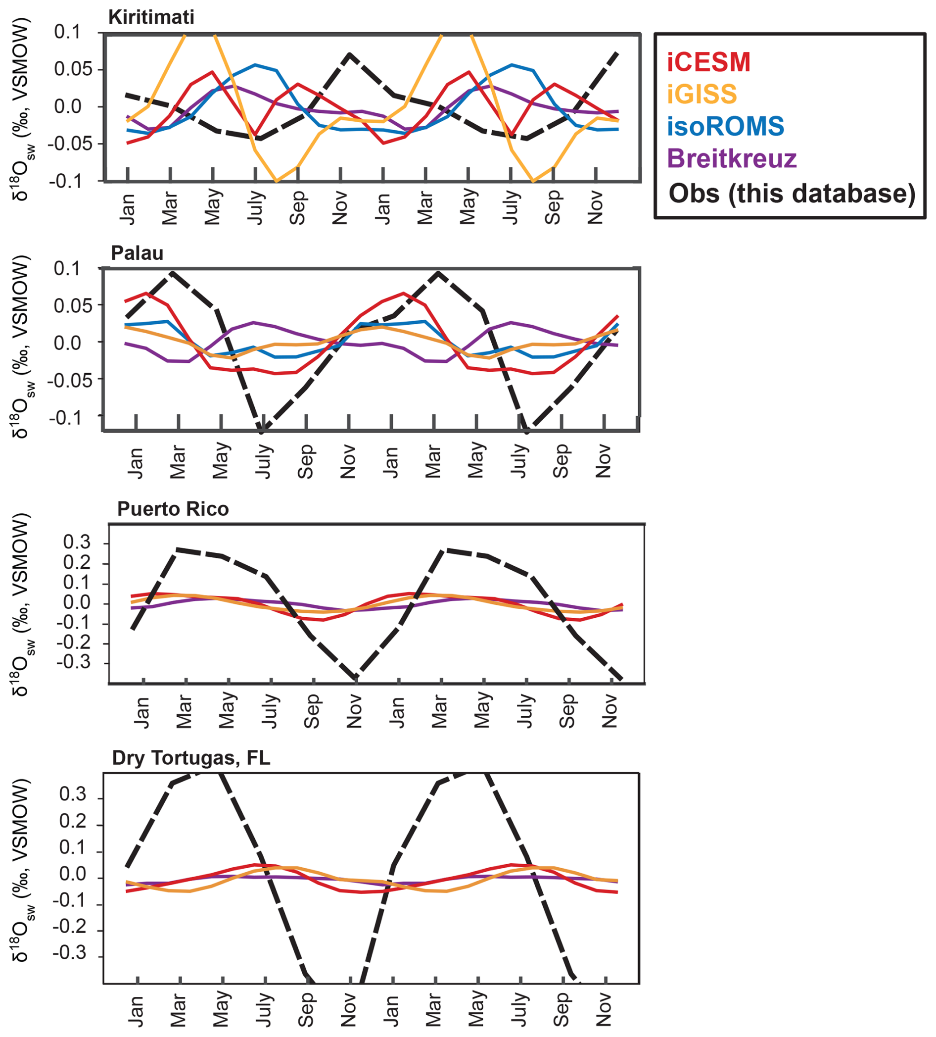 To assess how the δ18Osw data in the database compares with isotope-enabled climate model simulations and other products, we compare the climatological annual cycle in δ18Osw at different island sites using four data products: two simulations of isotope-enabled General Circulation Models (the National Center for Atmospheric Research Community Earth System Model Last Millennium Ensemble (1000 years; Brady et al., 2019) and the NASA Goddard Institute for Space Studies E2-R last millennium simulation (ensemble member E4rhLMgTck; 255 years; Colose et al., 2016)), a regional ocean model of the Pacific called isoROMS (44 years; Stevenson et al., 2018), and a gridded dataset of global monthly mean δ18Osw based on data assimilation with the MITgcm (Breitkreuz et al., 2018). The Breitkreuz dataset is based on a 400-year quasi-equilibrated simulation of a water isotope-enabled global ocean general circulation model constrained by global monthly δ18Osw data collected from 1950 to 2011 and climatological salinity and temperature data collected from 1951 to 1980.