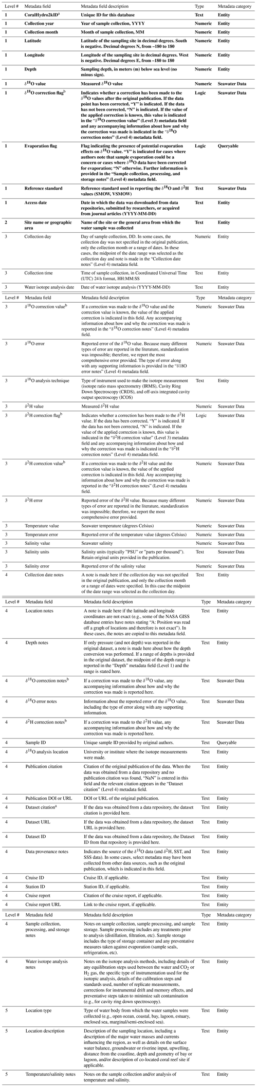 Table 1Description of all metadata fields in the PAGES CoralHydro2k Seawater δ18O Database. Bold text indicates required fields in the database (Level 1 and 2).