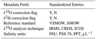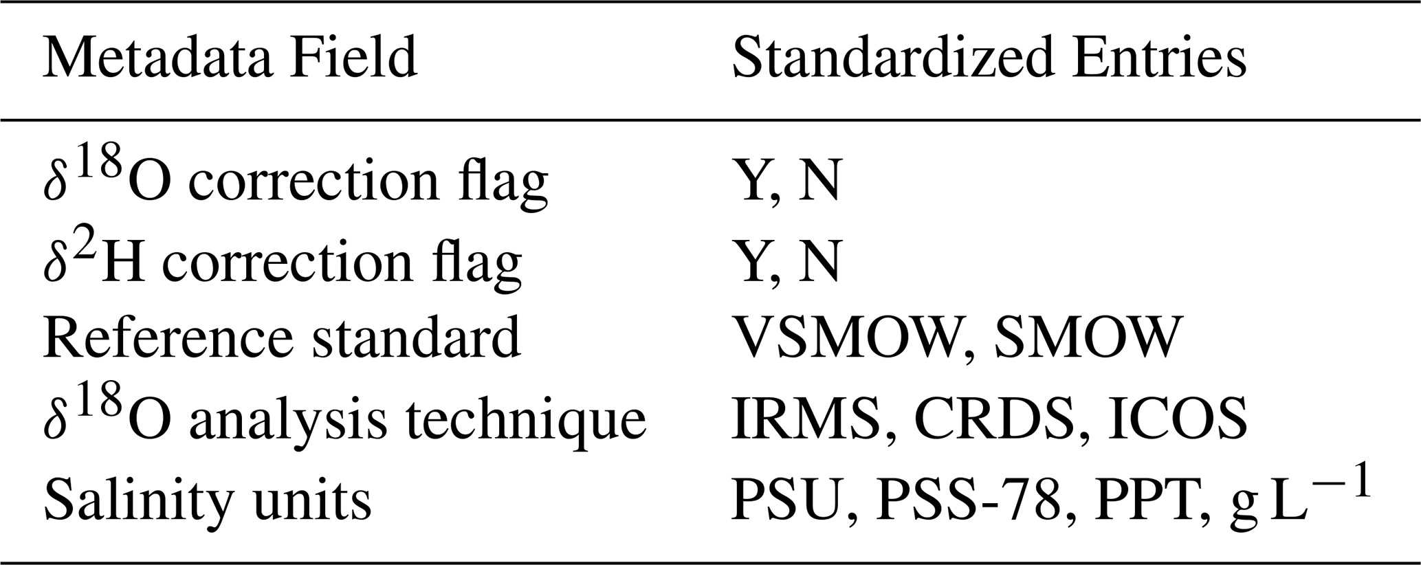 Level 4 metadata fields also add important supplementary information related to the seawater δ18O data, but they are not generalizable enough to use standardized vocabularies. They are also generally not available for all records and thus not required for inclusion in the database. They were subject to the highest QC standard. Examples of Level 4 metadata are: “δ18O correction notes”, “δ18O error notes”, “Sample ID”, “Publication citation”, “Dataset citation”, “Cruise ID”, “δ18O analysis location”, “Sample collection, processing, and storage notes”, and “Water isotope analysis notes”.