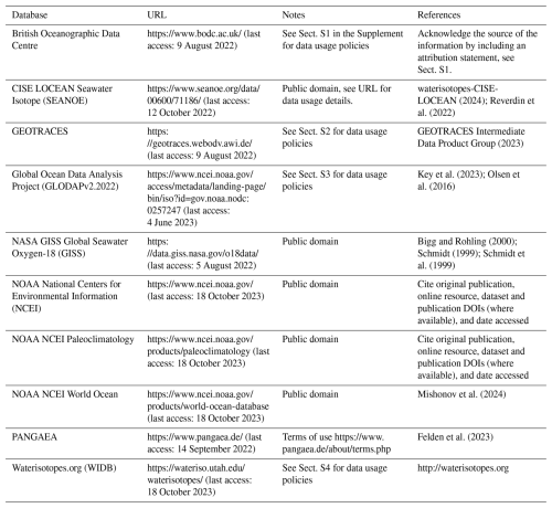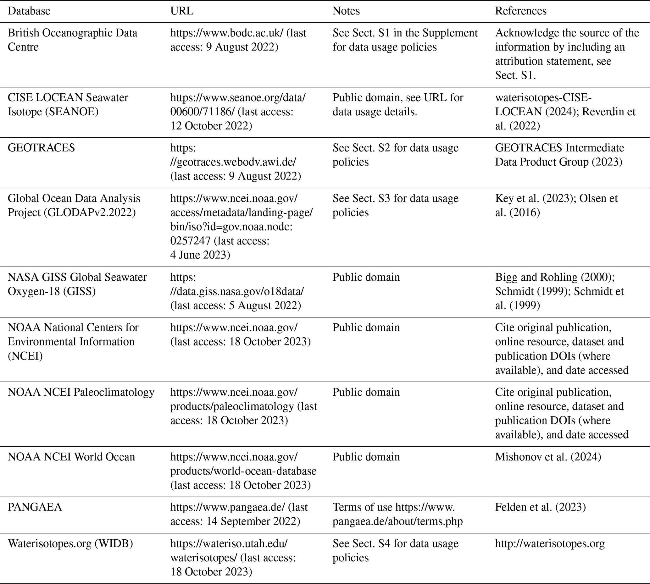 In recognition of the broad value of δ18Osw data to the Earth Sciences, a major effort to gather δ18Osw data occurred in the 1990s (Bigg and Rohling, 2000; Schmidt, 1999; Schmidt et al., 1999) and resulted in the development of the NASA's Goddard Institute for Space Studies (GISS) Global Seawater Oxygen-18 database (https://data.giss.nasa.gov/o18data/, last access: 20 February 2026), which contains over 26 000 global measurements of δ18Osw (and some δ2H data) from the 1950s to 2000s. In 2006, that database was used to construct a global gridded dataset of δ18Osw and to characterize regional relationships between δ18Osw and salinity (LeGrande and Schmidt, 2006) and it has subsequently been used in a broad range of studies involving δ18Osw. However, the NASA GISS database is no longer actively updated, with the last δ18Osw measurement added in 2011. As a result, a growing number of new δ18Osw datasets published since 2011 remain without an active δ18Osw-specific data repository in which to archive the data. Researchers have instead provided the δ18Osw data in the supplemental tables of journal articles, or have archived the δ18Osw data with other geochemical data (e.g., coral δ18O), in data repositories such as the National Centers for Environmental Information (NCEI) for Paleoclimatology (https://www.ncei.noaa.gov/products/paleoclimatology, last access: 20 February 2026) and PANGAEA (https://www.pangaea.de/, last access: 20 February 2026). Because these datasets can be difficult to find, non-machine-readable, and/or decentralized, they are not easily accessible to the wide range of research communities that would benefit from this data (see a related review by Chamberlain et al., 2021). Furthermore, many publishers and several funding agencies now require researchers to archive their data in FAIR and public repositories. For these reasons, a comprehensive database of δ18Osw data that is publicly available and actively maintained is critically needed.