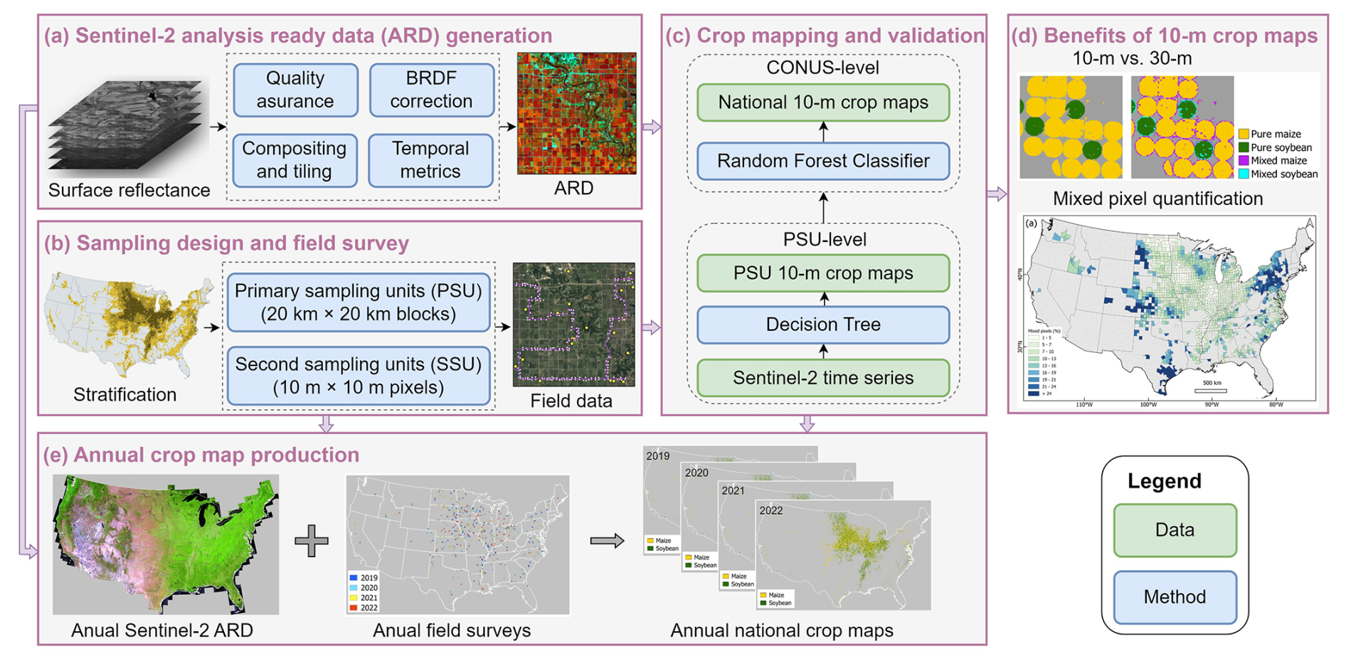 The objective of this study is to develop annual 10 m crop maps with Sentinel-2 time series. We also quantify the benefits of 10 m maps compared to existing 30 m products. In this study, we generated annual maize and soybean maps at 10 m spatial resolution over the entire Contiguous US (CONUS), from 2019 to 2022. We also quantified the benefits of our 10 m crop maps in mixed pixel reduction compared to 30 m maps, at field, regional and national scales. We improved a workflow developed in previous studies (Li et al., 2023; Song et al., 2017) by combining satellite analysis ready data (ARD) generation, field survey design, and machine learning. An overview workflow for annual crop map production is presented in Fig. 1.