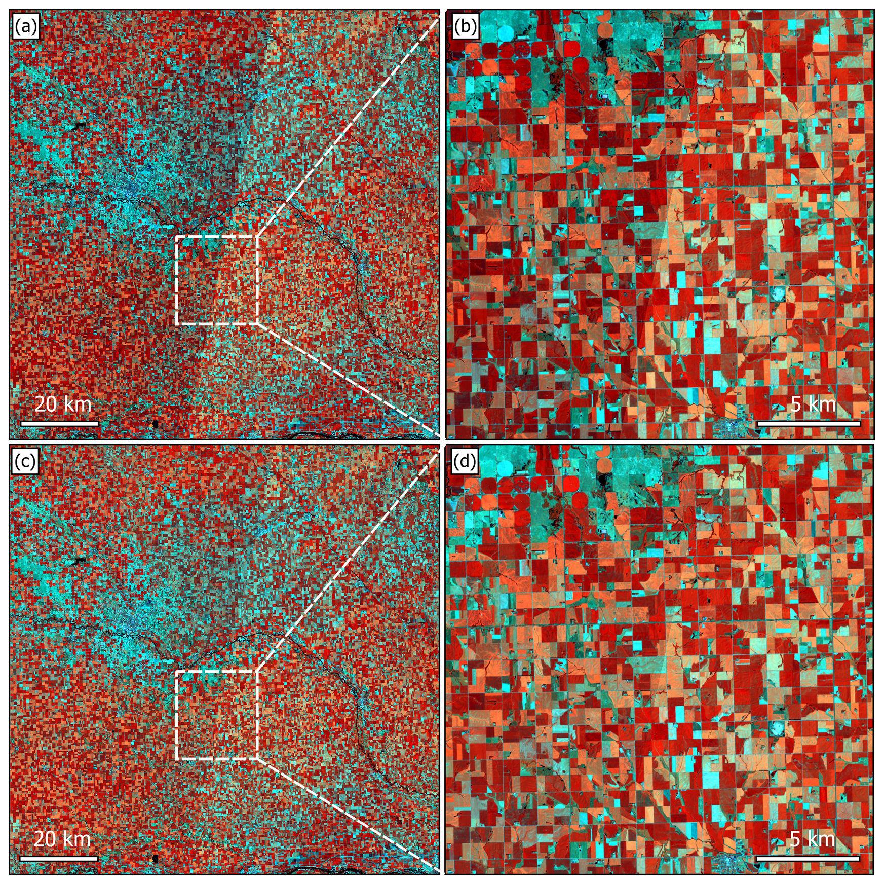 Figure 2Sentinel-2 false color composites (R: NIR, G: SWIR1, B: SWIR2) over a selected UTM tile 14TMP centered at (97.131° W, 41.942° N). (a–b) Surface reflectance. (c–d) Nadir BRDF-adjusted reflectance (NBAR). Two overlapping Sentinel-2B swaths acquired from orbit R112 on 18 July 2022 (backscattering direction) and orbit R012 on 21 July 2022 (forward scattering direction) were used. The orbit R112 data were overlaid on the orbit R012 data where they overlapped. All composites are displayed with the same stretch parameters. Figure contains modified Copernicus Sentinel data (2022).