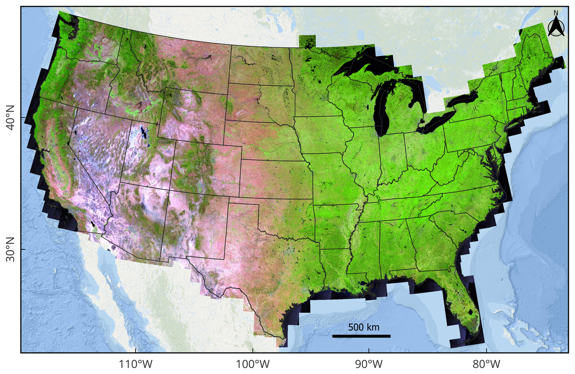 Figure 3Sentinel-2 composites over the United States in 2022. The composites were created using the average value of nadir Bidirectional Reflectance Distribution Function (BRDF)-adjusted reflectance (NBAR) between the 25th and 75th percentiles from observations ranked by individual bands (R: SWIR1, G: NIR, B: Red). The original 10 m data are resampled to 250 m using the nearest neighbor for visualization purposes. Background base map source: Esri | Powered by Esri.