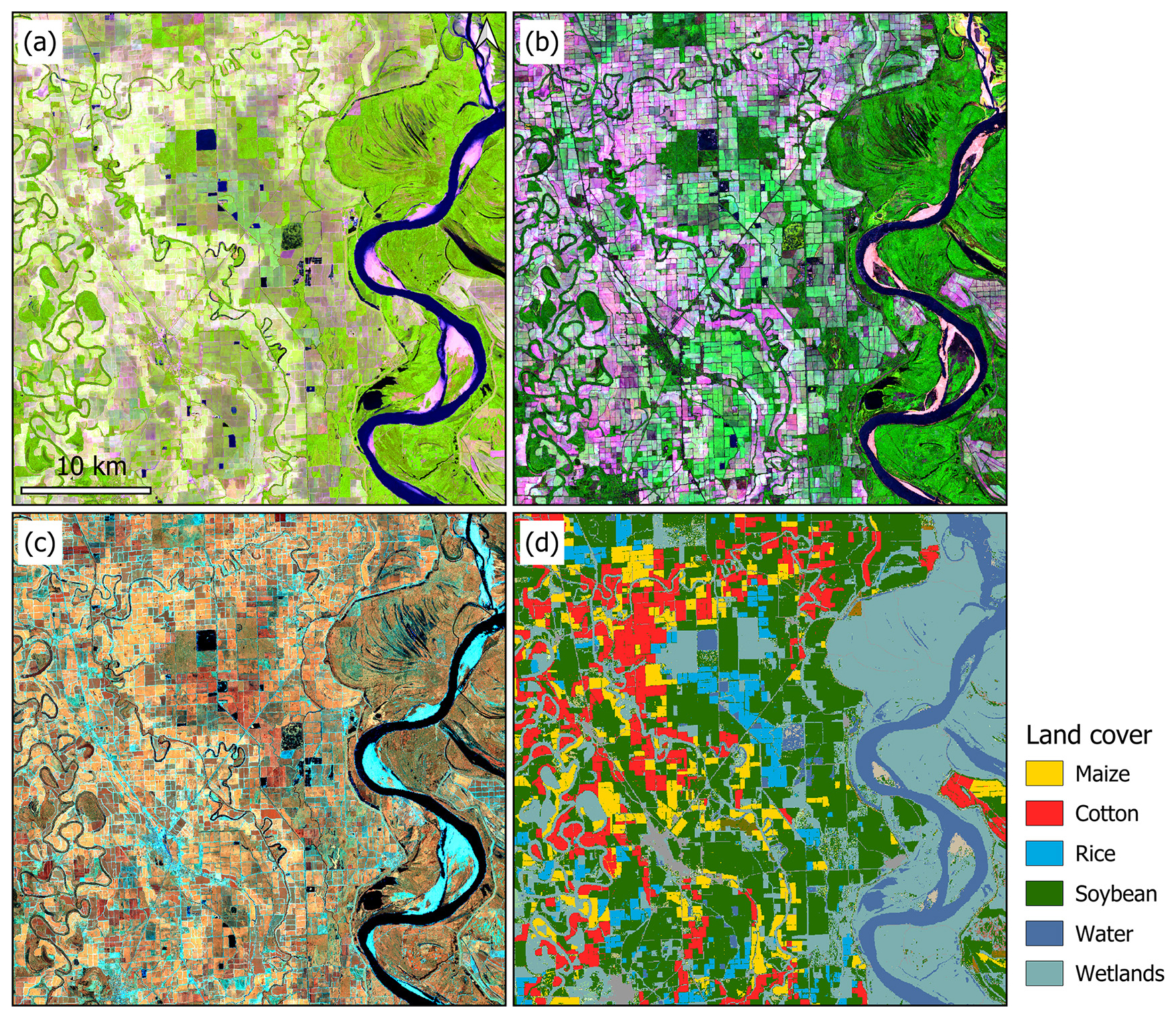 Figure 4Composites of Sentinel-2 multi-temporal metrics in the Mississippi Valley. (a) SWIR1-NIR-Red composite of NBAR average between the 25th and 75th percentiles from observations ranked by individual bands; (b) SWIR1-NIR-Red composite of NBAR amplitude between the second maximum and the second minimum values; (c) NIR-SWIR1-SWIR2 composites of average NBAR between the 90th percentile and the second maximum values from observations ranked by NDVI; (d) 2022 Cropland Data Layer. The coordinate of the center point is (91.312° W, 33.665° N). All panels are displayed in the same scale at 10 m resolution. Figure contains modified Copernicus Sentinel data (2022).