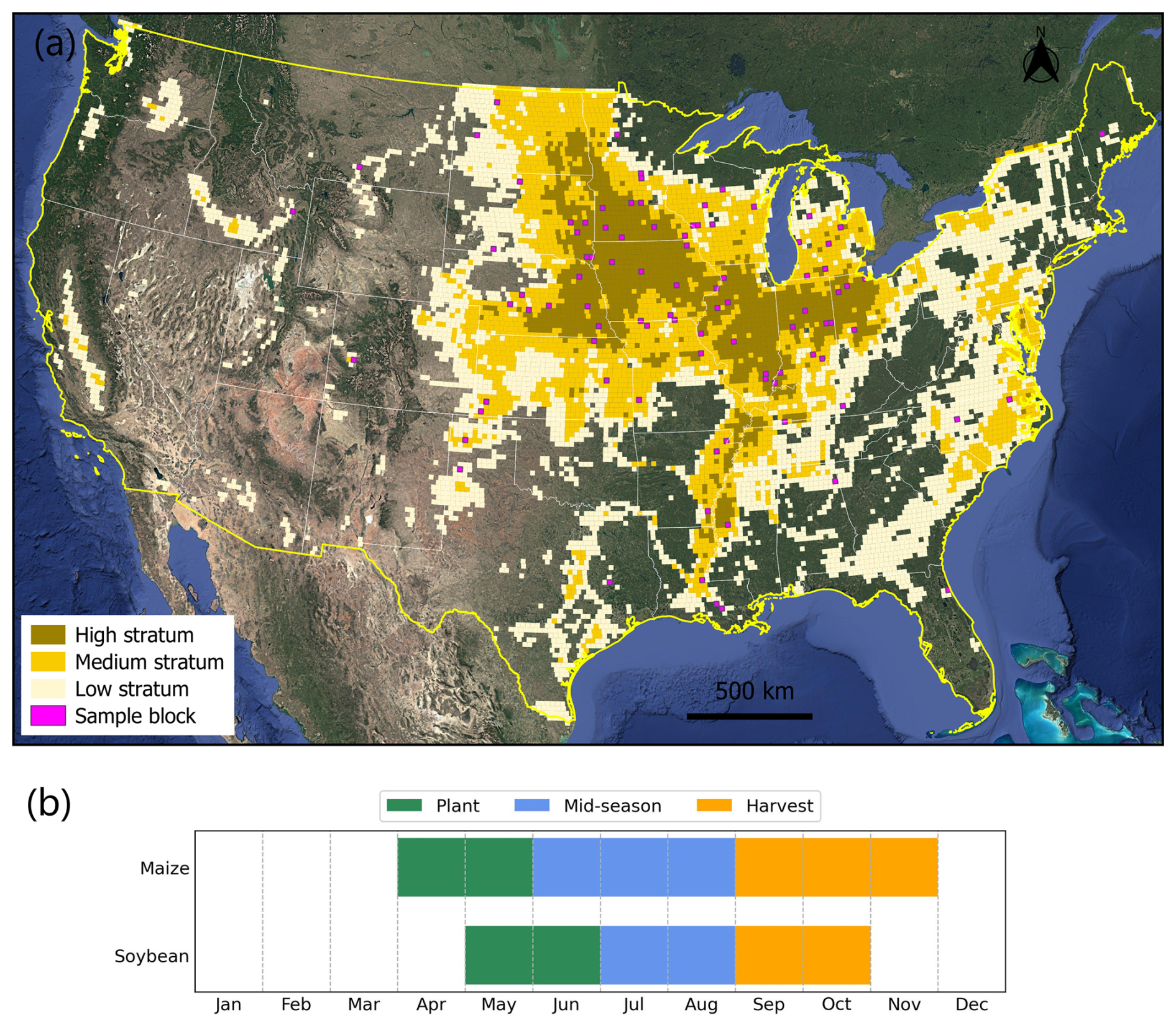 Figure 52022 stratified sampling design for field survey. (a) Stratified sampling design. 20 km × 20 km equal-area blocks were stratified into high, medium and low strata. (b) Crop calendar for maize and soybean over the US. Satellite base map is from Imagery © 2025 Landsat/Copernicus, Map data © 2025 Google.