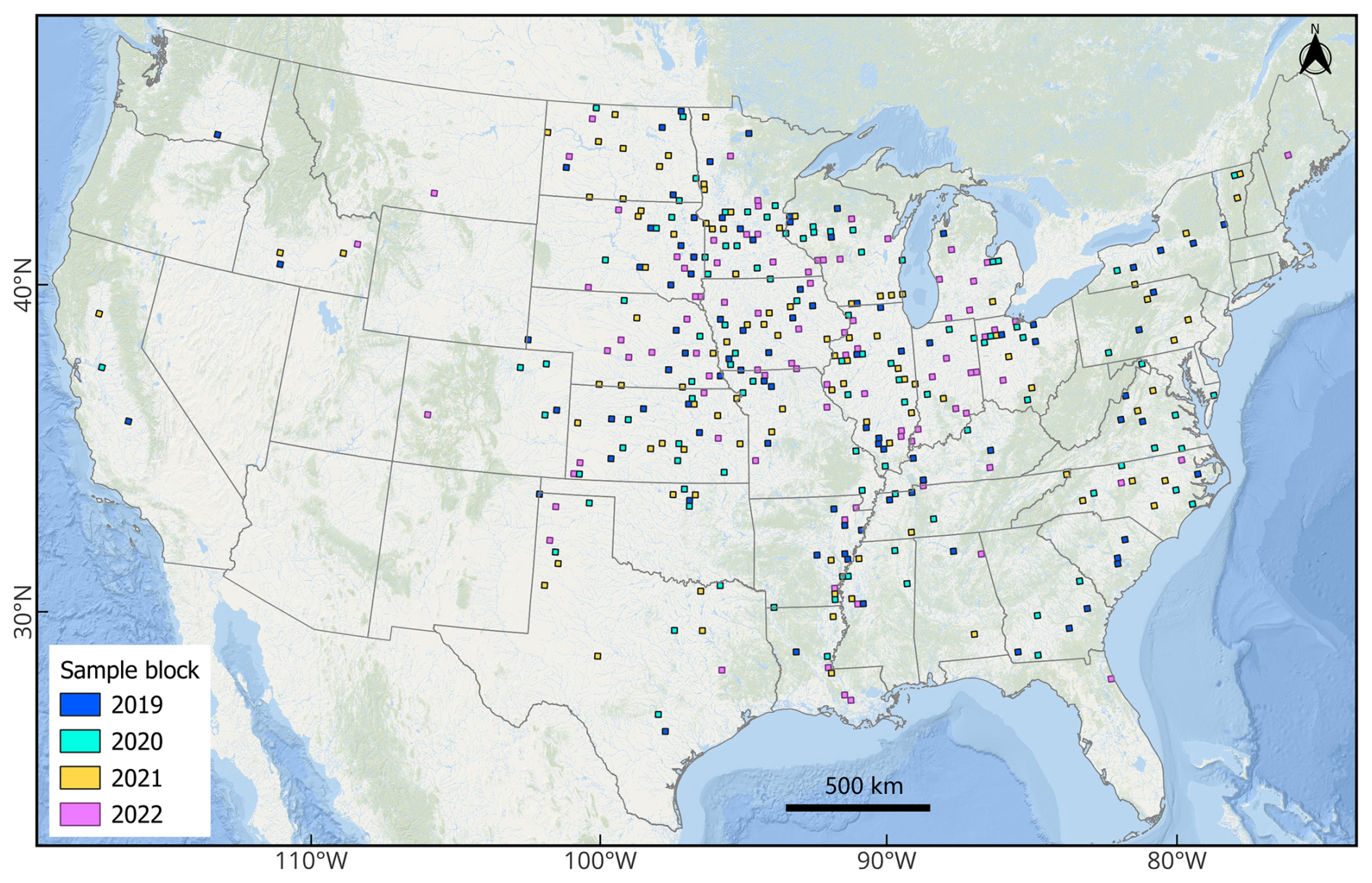 The typical planting season of the US maize starts in April while soybean planting starts in May; the harvesting season starts in September and ends in November for maize and in October for soybean (see Fig. 5b above). We conducted the field survey during the peak growing season in July and August. Consistent with previous research (Li et al., 2023; Song et al., 2021a), we collected two types of datasets during the field survey: (1) ground reference data over the probability sample of SSUs for map evaluation and crop area estimation; and (2) “windshield survey” reference data for model training. These windshield survey data were collected along the driving routes between the SSUs, and were only used to train models for classification and not for validation, whereas the probability sample was exclusively used for validation.