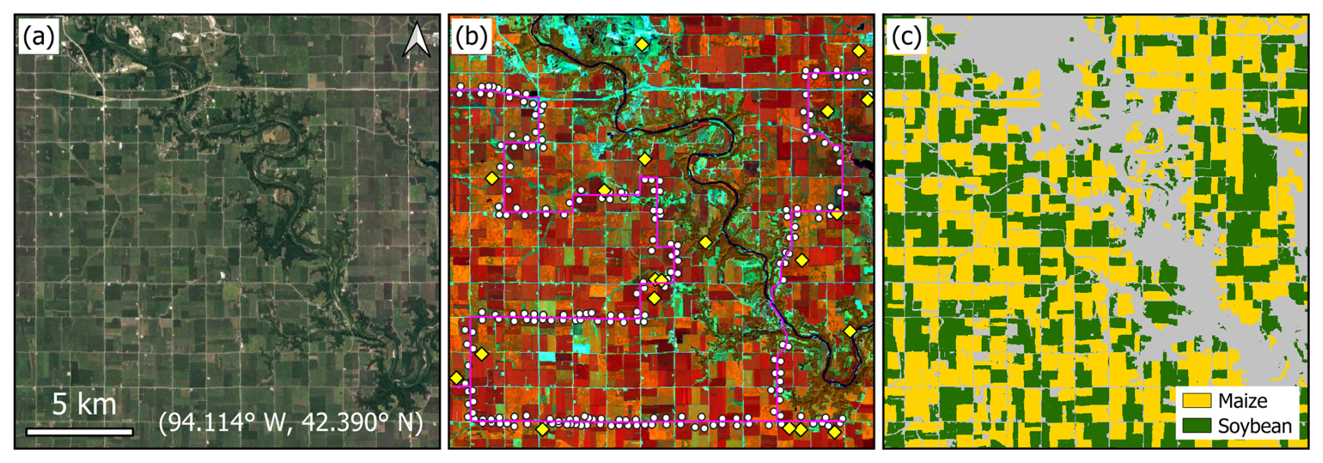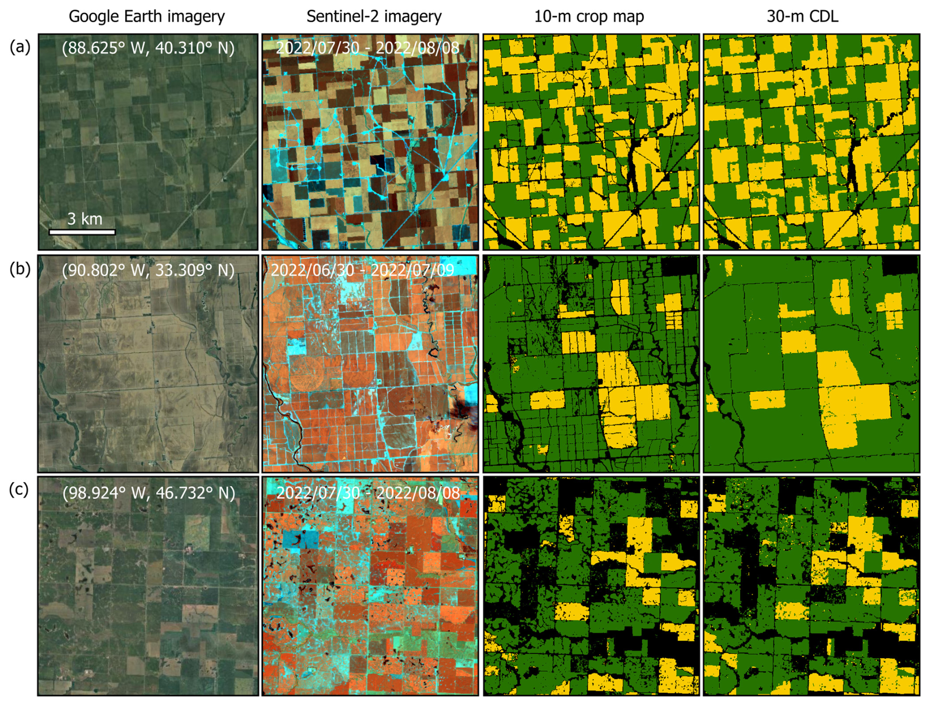 Figure 9Maize and soybean classification in 2022 over selected regions. Rows (a)(c) are representative sites in Illinois, Mississippi, and North Dakota. All panels are displayed at the same scale (10 km × 10 km). The coordinates of the center points are shown on Imagery © 2025 Landsat/Copernicus, Map data © 2025 Google. The 10 d composite periods are shown on the Sentinenl-2 image (R: NIR, G: SWIR1, B: SWIR2). Maize and soybean are shown in yellow and green colors, respectively.
