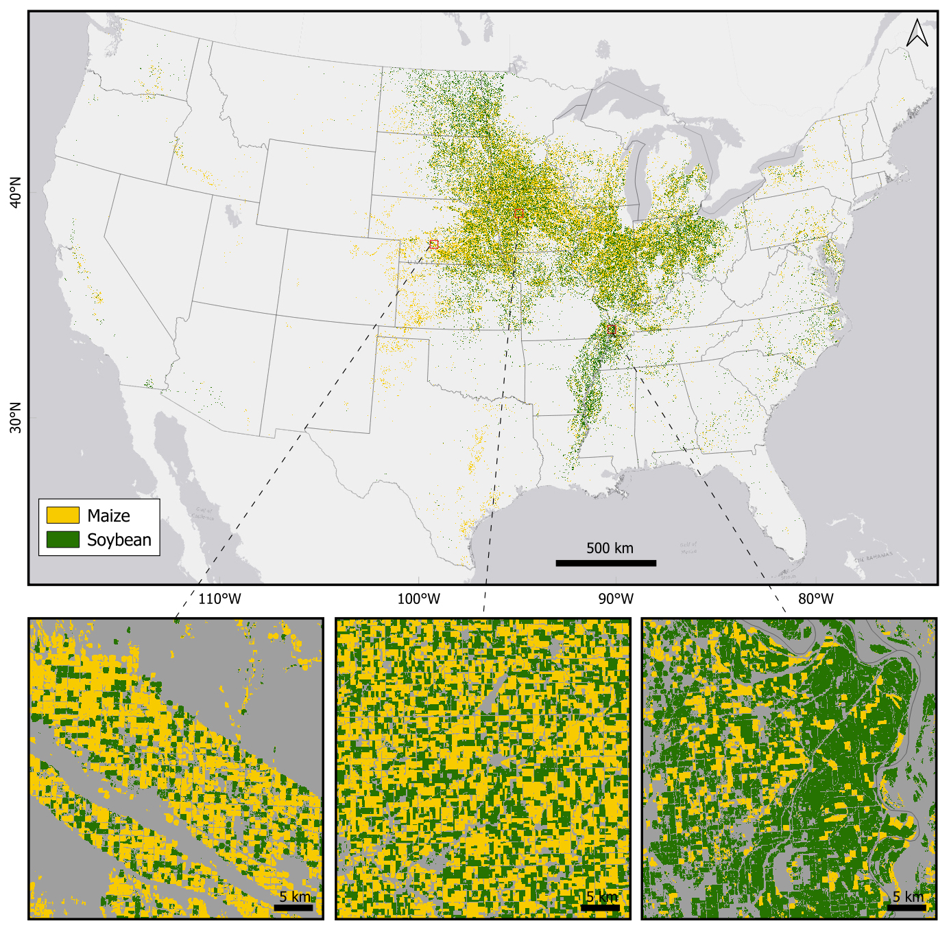 Li, H., Song, X.-P., Adusei, B., Pickering, J., Lima, A., Poulson, A., Baggett, A., Potapov, P., Khan, A., Zalles, V., Hernandez-Serna, A., Jantz, S. M., Pickens, A. H., Ortiz-Dominguez, C., Li, X., Kerr, T., Song, Z., Turubanova, S., Bongwele, E., Koy Kondjo, H., Komarova, A., Stehman, S. V., and Hansen, M. C.: 2019–2022 10-m maize and soybean maps over the United States, FigShare [data set], https://doi.org/10.6084/m9.figshare.28934993.v2, 2025.
