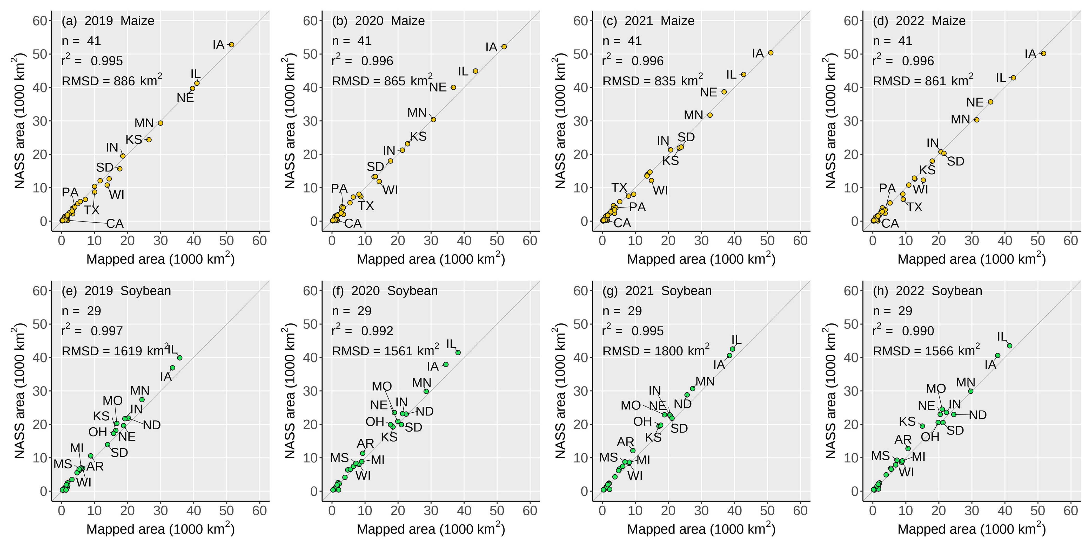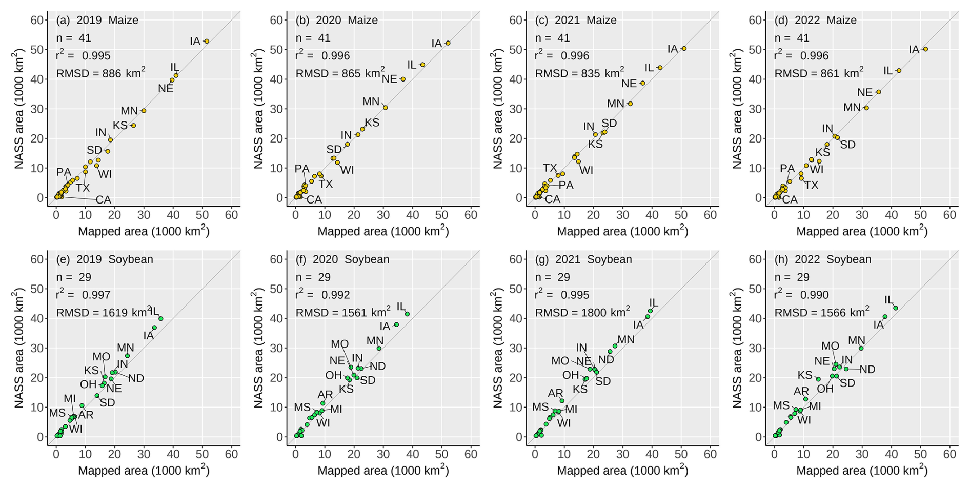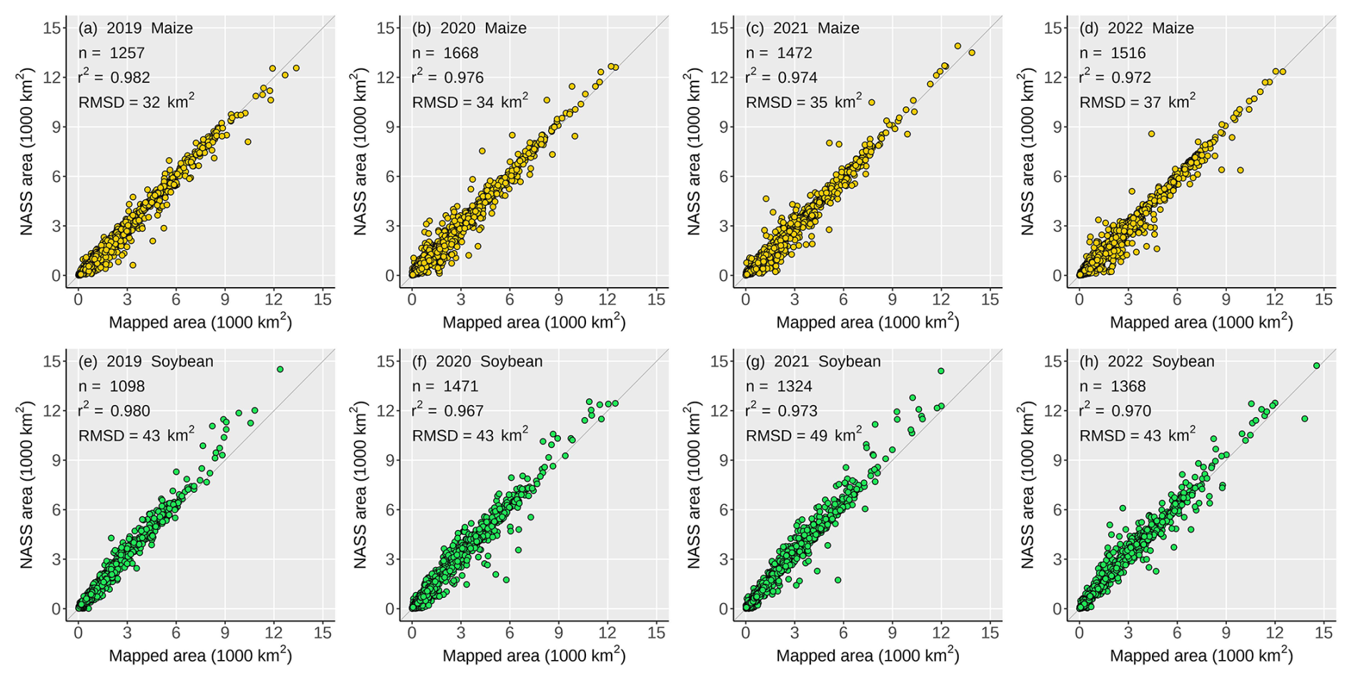 We derived the pixel-counting-based crop areas for maize and soybean from the annual crop maps, for each year from 2019 to 2022. We compared these crop areas with the official statistical crop areas from the USDA NASS at the county and state levels. We then calculated root-mean-square-difference (RMSD) and r2 between the mapped crop areas and the statistical areas.