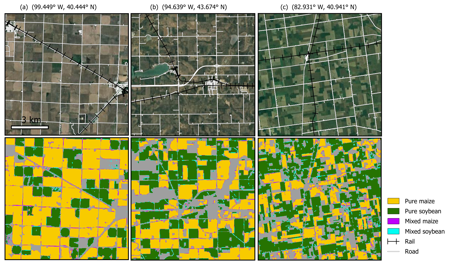 Figure 12The 2022 aggregated 30 m maize and soybean map overlaid with road and rail networks. Columns (a)(c) are selected sites in Nebraska, Minnesota, and Ohio. The 30 m map was derived by spatially aggregating the 10 m map by calculating the fractional cover and categorized as pure pixels with 100 % cover or mixed pixels with <100 % cover. All panels are displayed at the same scale (10 km × 10 km). The coordinates of the center points are shown on Imagery © 2025 Landsat/Copernicus, Map data © 2025 Google. The rail and road networks are obtained from the US TIGER database.