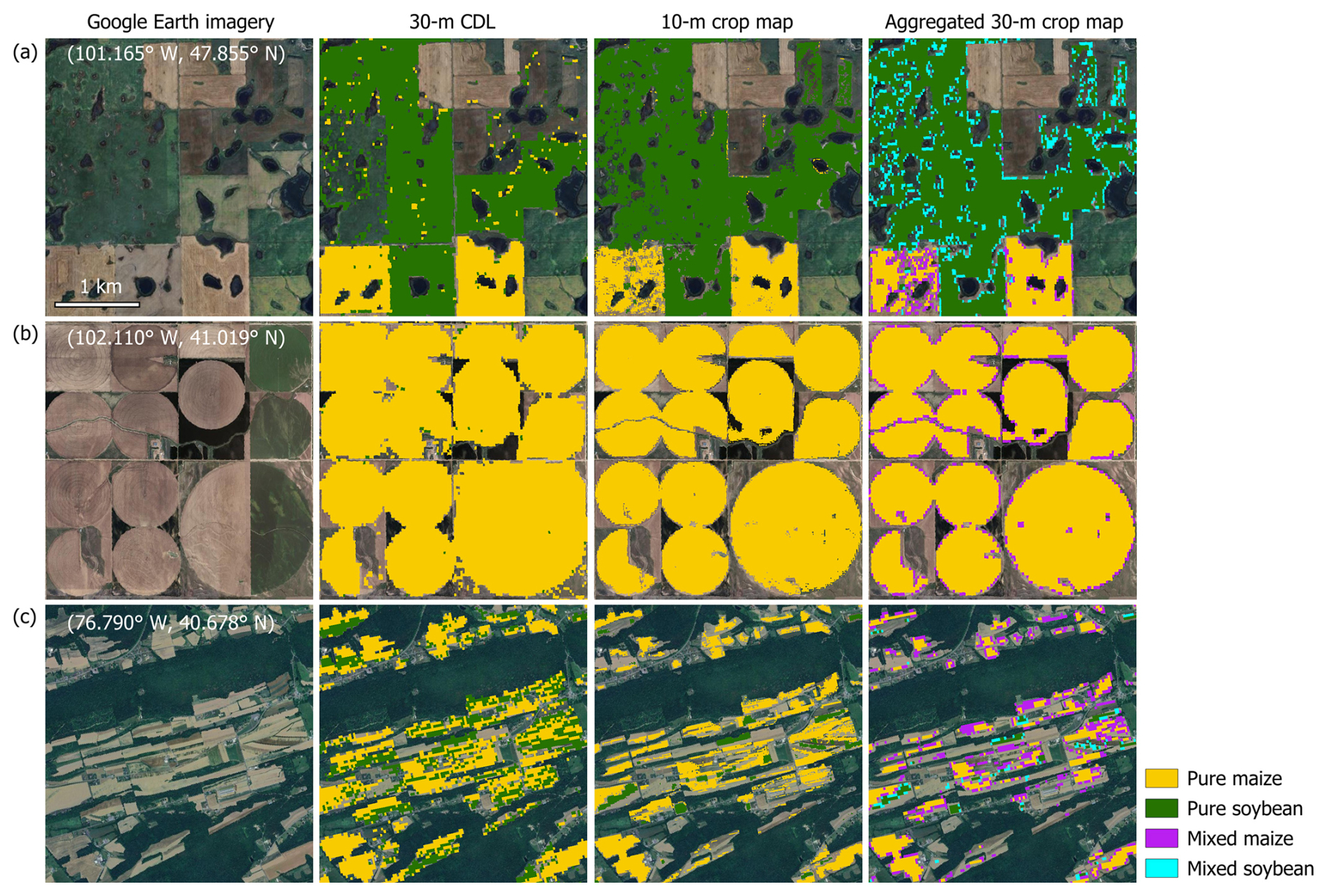 Figure 13The 2022 aggregated 30 m maize and soybean map and CDL show mixed pixels in various landscapes. (a) Wetland/agriculture mosaics in North Dakota; (b) center-pivot irrigated fields in Nebraska; (c) strip fields in Pennsylvania. The coordinates of the center points are shown on Imagery © 2025 Landsat/Copernicus, Map data © 2025 Google.
