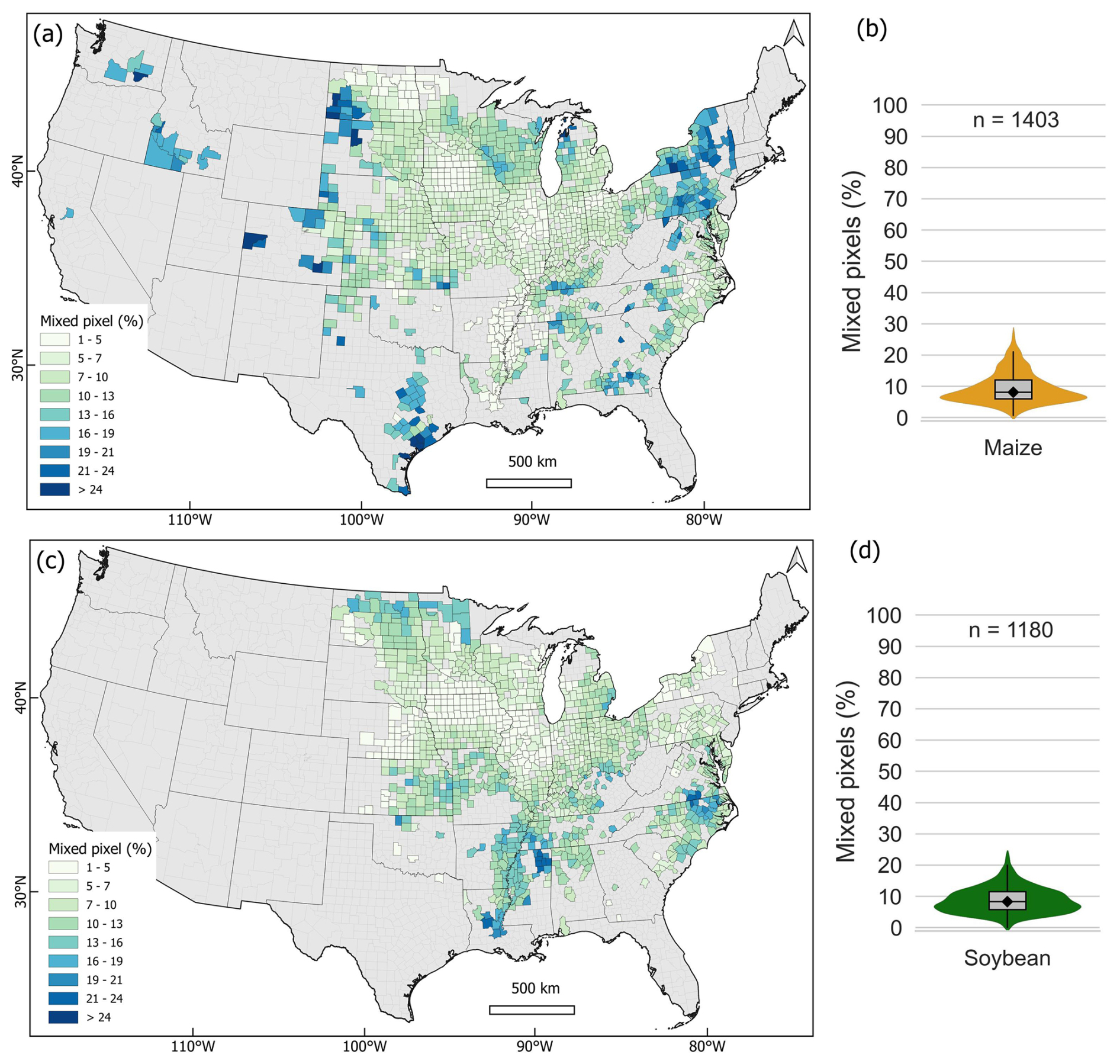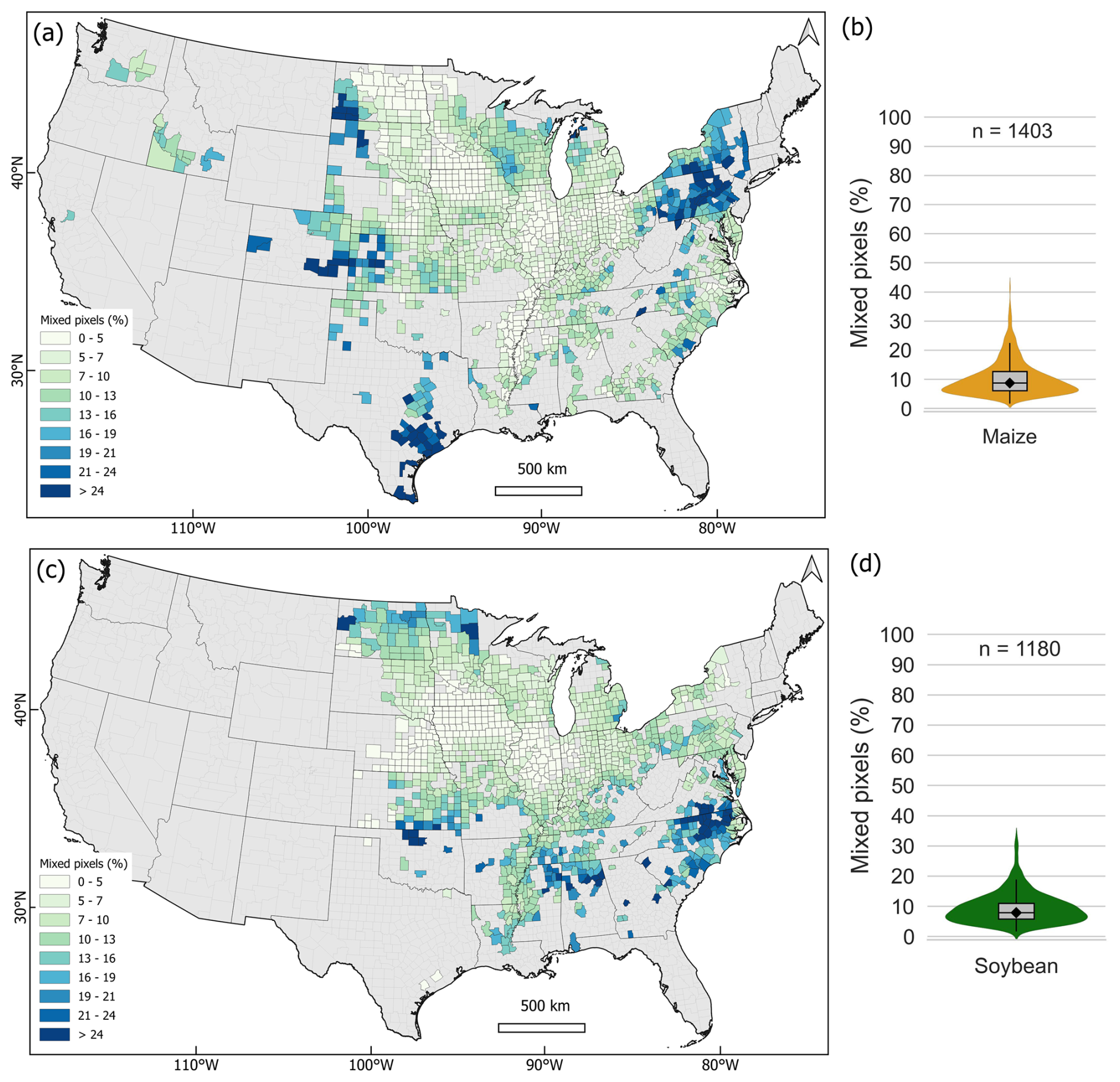 We obtained the percentage of mixed maize and soybean pixels at the county level to examine the spatial distribution of mixed pixel reduction from 30 to 10 m (Fig. 14). The counties with the highest maize and soybean production, such as those in Iowa, Illinois, and Nebraska, had the least mixed pixel percentages ranging from 1 % to 10 %, while counties in the upper Midwest, the North and South Plains, the northeast and eastern coast had more mixed pixels (Fig. 14a, c). Overall, the median percentages of mixed maize and soybean pixels in all counties were 8 % and 9 %, respectively (Fig. 14b, d). Our results show that increasing the spatial resolution of crop mapping from 30 to 10 m would reduce the number of mixed pixels by 8 %–9 % at the county scale, and substantially benefit many states outside of the Midwest region.