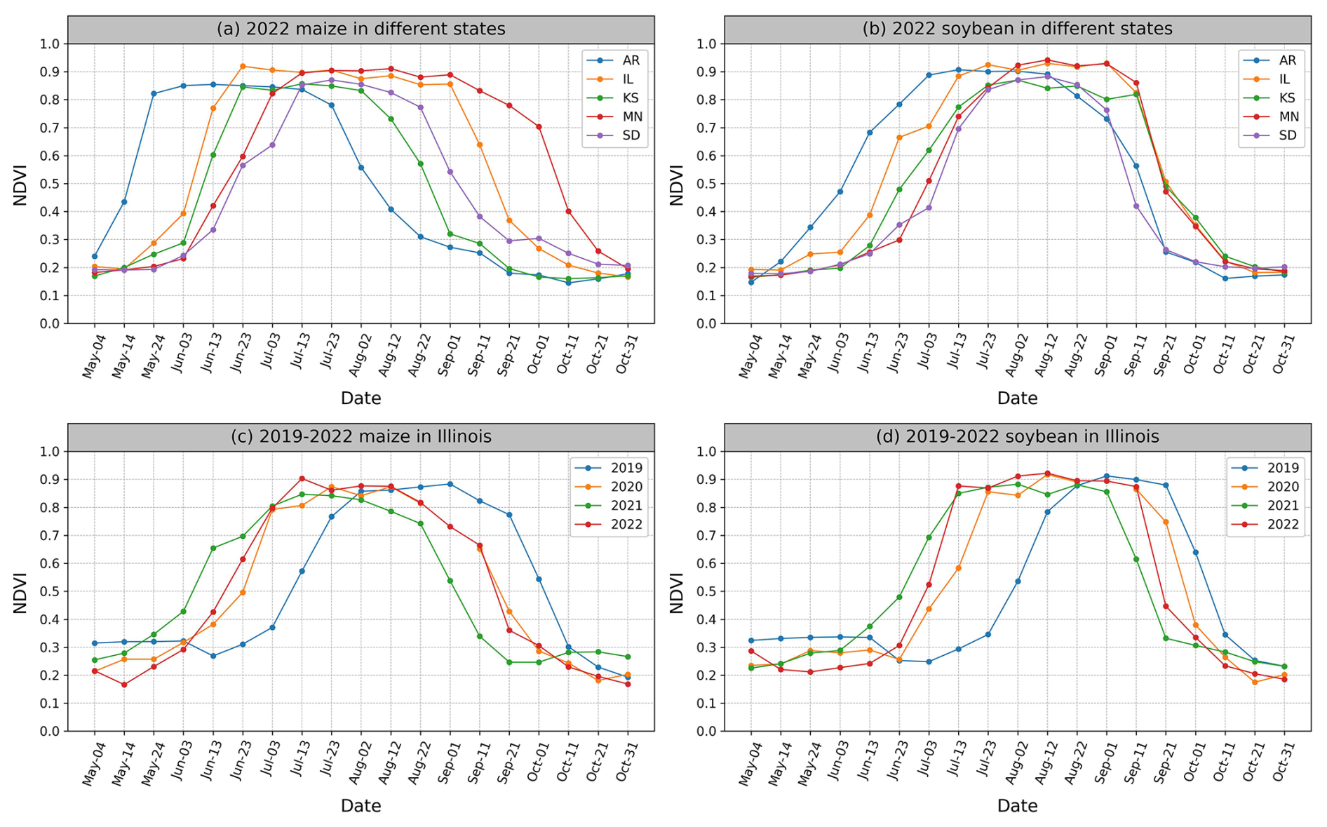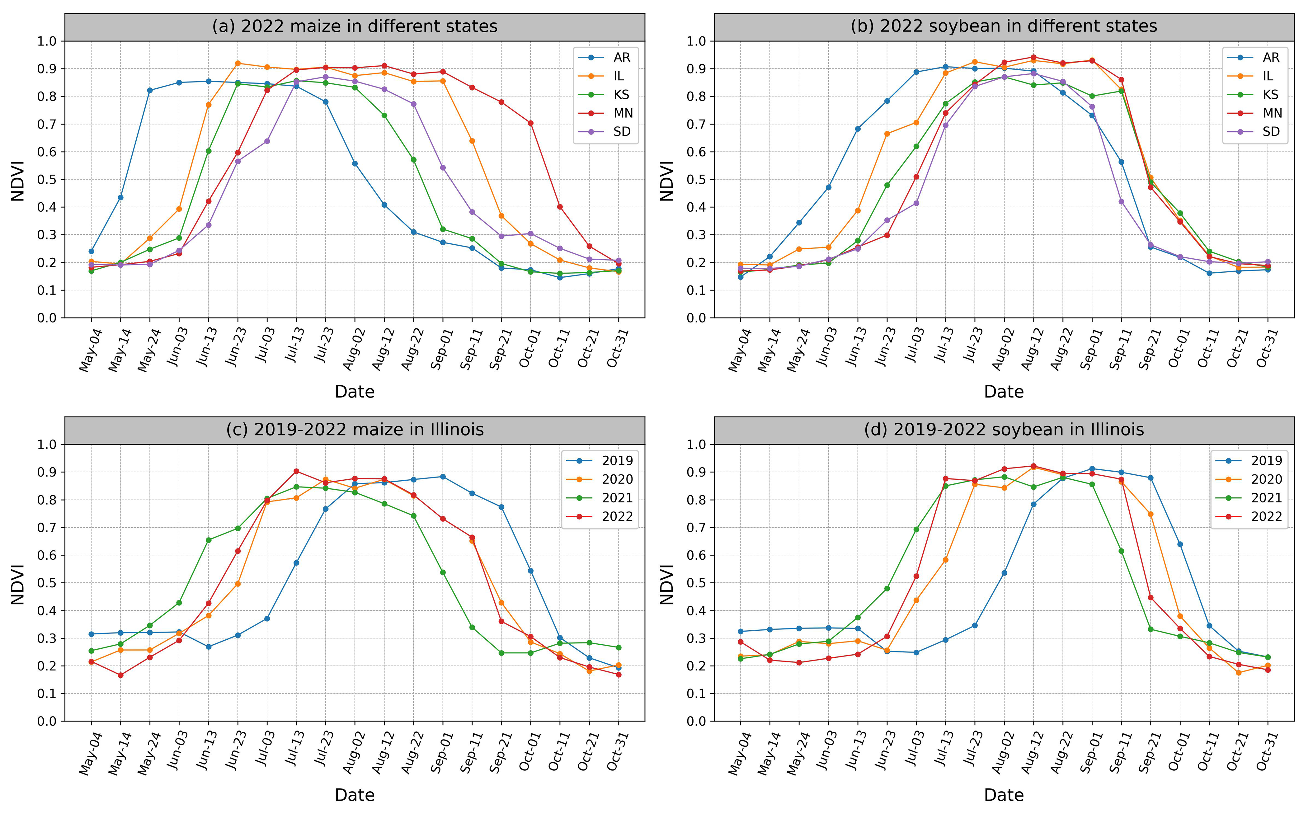 Spatiotemporal consistency in crop classifications is necessary to make annual crop maps comparable and thus allow long-term crop monitoring and change analysis. Yet this is undermined partly due to crop phenology variations across large extents, depending on soil properties, planting dates, and weather conditions, among other factors (Deines et al., 2023; Yang et al., 2017). On one hand, within a calendar year, crop progress is regionally different. To address this issue, some studies trained regional models through agroecological zoning, which requires zone-specific training and validation (de Abelleyra et al., 2020; Wardlow and Egbert, 2008). On the other hand, yearly unaligned phenological profiles can jeopardize the classification consistency across years, especially when extreme weather events occur (Manoochehr et al., 2021). Given these interannual variations, classifiers that accurately identify crops in average normal growing seasons using single-date or time-series satellite imagery may perform poorly for abnormal years. To this end, researchers proposed yearly specific classifications (Massey et al., 2017; Som-ard et al., 2022). However, these annual models need fine-tuning based on reference data from each corresponding year especially when encountering unseen growing trends, and thus cannot be generalized for long-term periods.