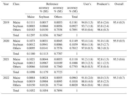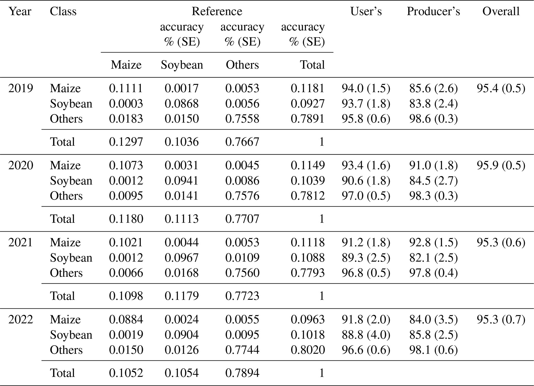 Table 1Accuracy assessment for maize and soybean maps from 2019 to 2022. Cell entries in the confusion matrices represent area proportions. Reference data were derived from probability samples of secondary sampling units (SSUs).