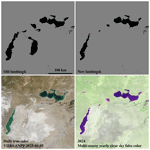 In most cases, the endorheic basins have relatively simple boundaries due to water filling in relatively flat plains. In these cases, we find that deriving the land mask from the false color imagery at medium resolution is appropriate. While the spatial boundaries may not be as complex, the temporal changes can be quite frequent, often following a seasonal cycle, but also stretching over multi-year time scales. Due to ever changing nature of these water bodies, care is needed to select a representative sample for deriving the land mask.