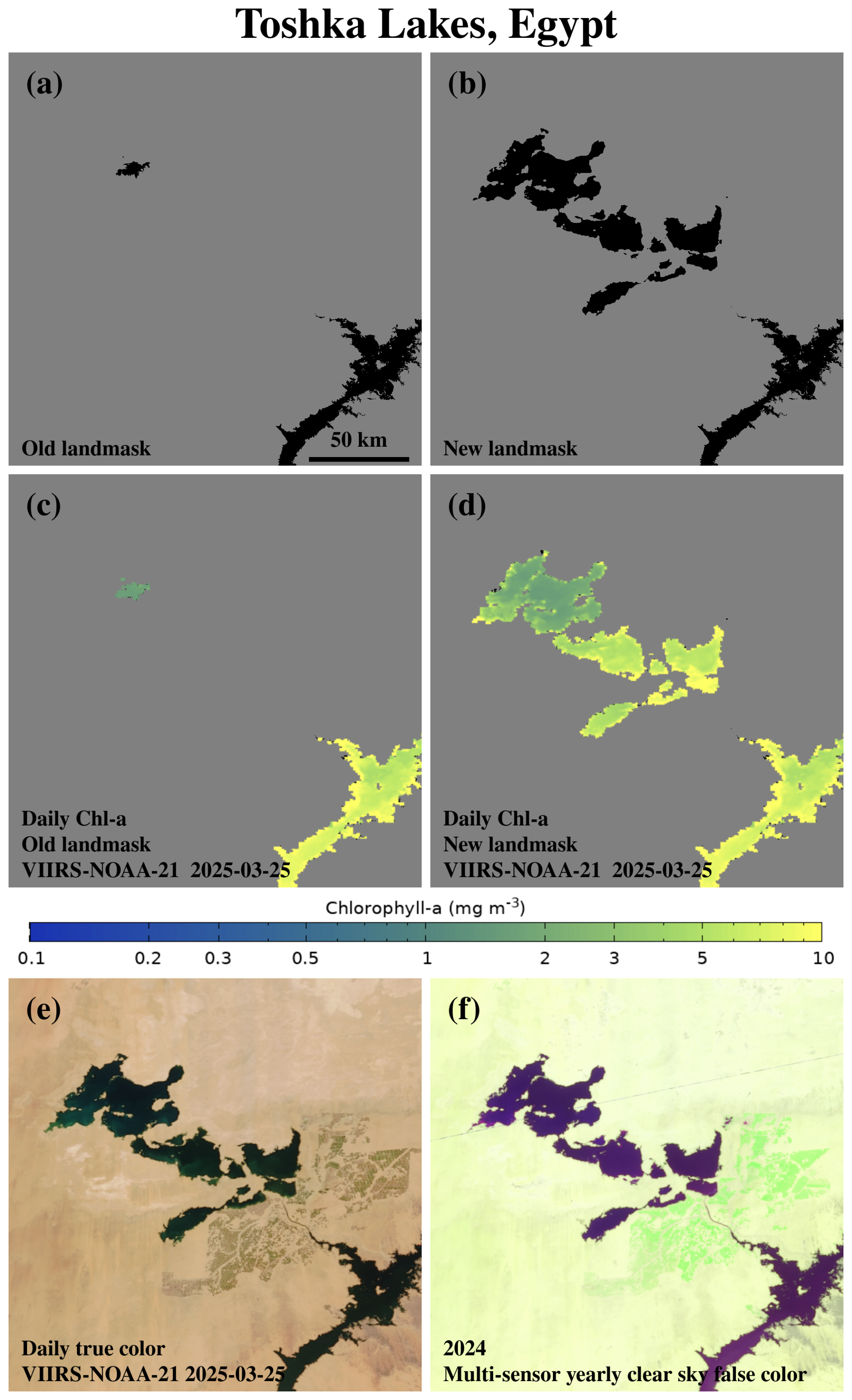 Figure 1The extent of Toshka Lakes, Egypt, in the old land mask (a) and the updated land mask (b), along with the corresponding daily Chl-a retrievals (c, d) from VIIRS-NOAA-21 on 25 March 2025, and the true color imagery (e). The multi-sensor yearly clear-sky false color imagery (f) obtained from VIIRS SNPP and NOAA-21 daily false color imageries over 2024 shows nearly identical water surface coverage as the daily true color imagery (e).