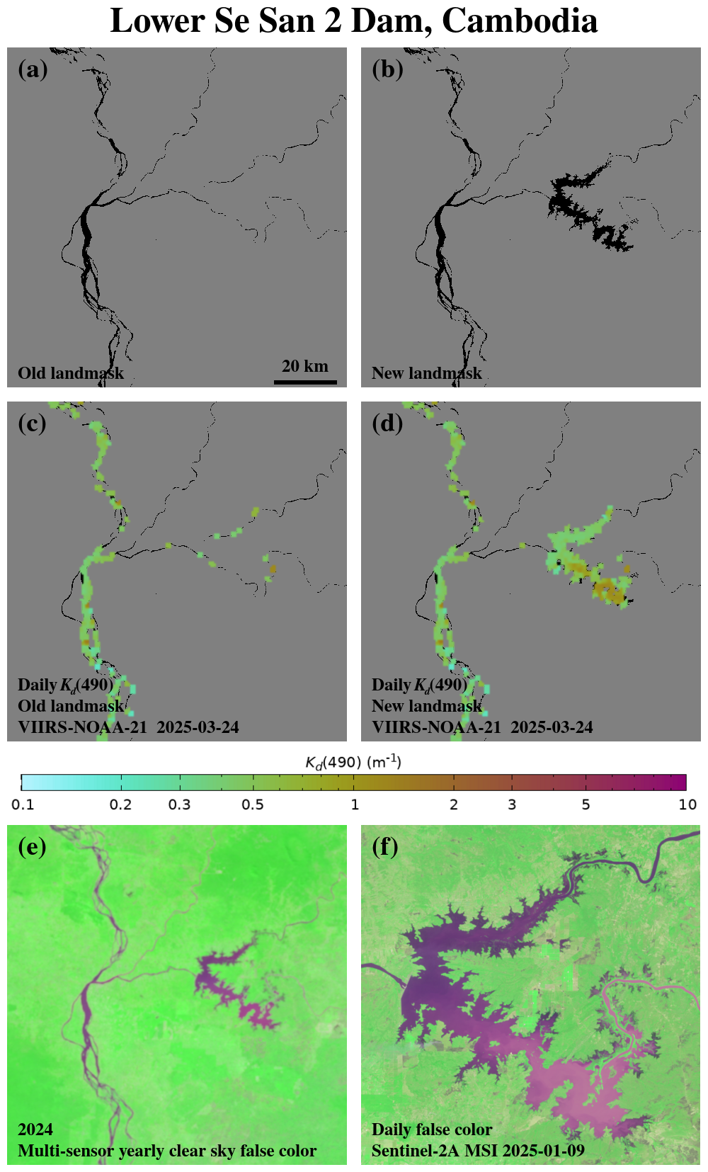 Figure 3The land mask changes in lower Mekong River basin in Cambodia for (a) the old land mask showing Mekong River and its tributaries in the northern part of Cambodia, (b) updated land mask with the reservoir created by Lower Se San Dam 2 (right side), and VIIRS-NOAA-21-derived daily Kd(490) with (c) the old and (d) the updated land mask, respectively. Panel (e) shows the corresponding yearly clear-sky false color imagery and panel (f) shows the detailed view of the impounded basin in the daily false color imagery derived from Sentinel-2A MSI scene, captured on 9 January 2025.
