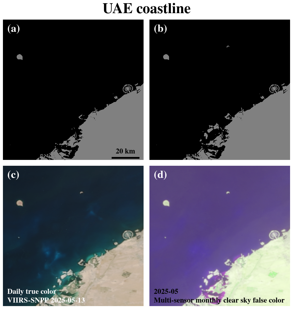 Figure 4Changes between the old and updated land masks due to land reclamation projects near the UAE coastline of (a) old land mask before changes, (b) the updated land mask showing the Crescent Island (top center right) and large scale land reclamation near coast, (c) VIIRS-SNPP true color imagery on 13 May 2025, and (d) monthly clear-sky imagery derived from daily VIIRS-SNPP and VIIRS-NOAA-21 false color imageries in May 2025.