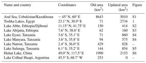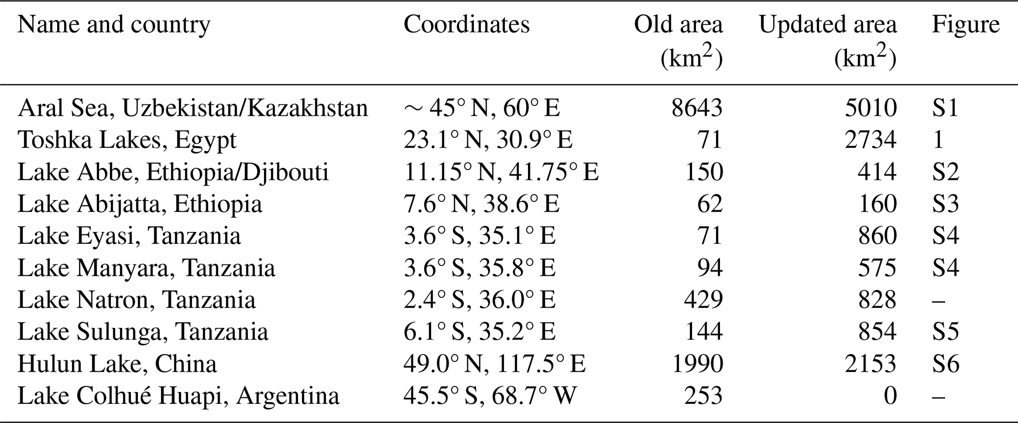 Other cases of endorheic lakes with changes in size and extent incorporated in the updated land mask are included in Sect. S1 in the Supplement. All changes are summarized in Table 1. The “old” and “updated” areas listed in Table 1 refer to the areas derived from the land mask data in the earlier work (Mikelsons et al., 2021) and the current/updated version, respectively. Both of these represent estimated areas for medium (250 m) resolution satellite sensor based ocean/water color retrievals and may differ from the actual area obtained using the high resolution measurements. Most of the endorheic lakes in East Africa (primarily in Ethiopia and Tanzania) have seen increase of surface area due to increased rainfall in recent years (Byrne et al., 2024). Likewise, Lake Hulun in China has seen an expansion in recent years (Gao et al., 2024). Lastly, Lake Colhué Huapi in Argentina has disappeared for all but few weeks in the months of April and May, and has been removed in the updated water mask map.