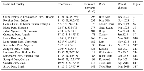 Table 2List of new and changed river dam reservoirs in Africa and South America.