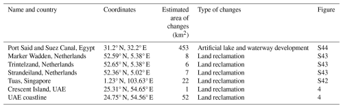 Another type of human induced changes to global surface waters is due to land reclamation, and changes to land and water surface cover in coastal regions. Such changes are typically very gradual and can be readily identified in satellite daily imagery or clear-sky imagery derived over a longer time period. Figure 4 shows such changes near the coastline of the United Arab Emirates (UAE), with the updated land mask (Fig. 4b) closely resembling the true and false color imagery (Fig. 4c and d, respectively). The updated land mask (Fig. 4b) adds offshore Crescent Island and newly reclaimed lands near the UAE coastline (Subraelu et al., 2022), absent in the old land mask (Fig. 4a). Other recorded areas of land reclamation projects (see Table 4) include establishment of new polders in Markermeer, the Netherlands, and a port expansion in Singapore. However, the largest total area of changes between the old and updated land masks were seen in Egypt, partly due to expansion of the Suez Canal, but mostly due to changes in the nearby Nile wetlands, also related to human activities. This includes both areas previously seen as water in the old land mask and identified as land in the updated one, and vice versa.
