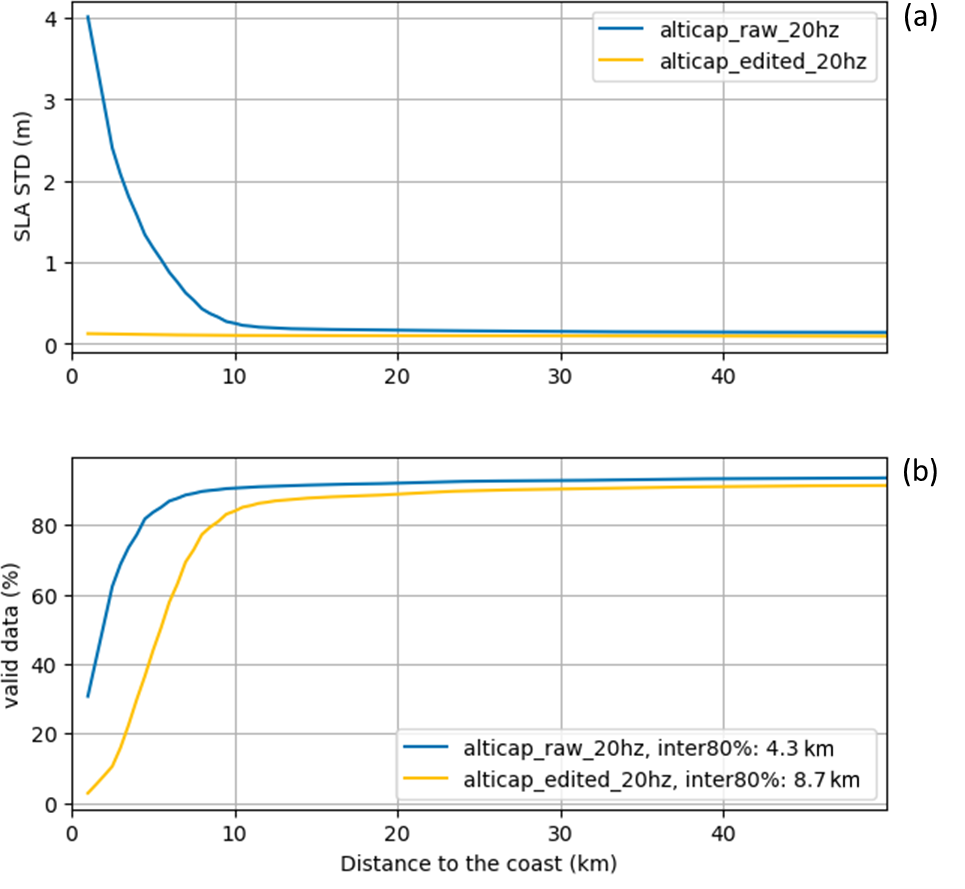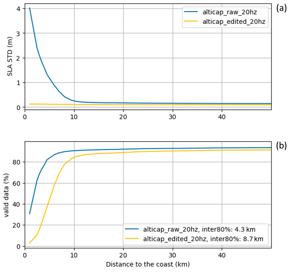 Figure 2Standard deviation (a) in meters, and percentage (b) of SLA data as a function of the distance to the coast, for the raw (blue) and edited (orange) ALTICAP SLAs. Inter80 % refers to the distance to the coast at which 80 % of data availability is obtained.