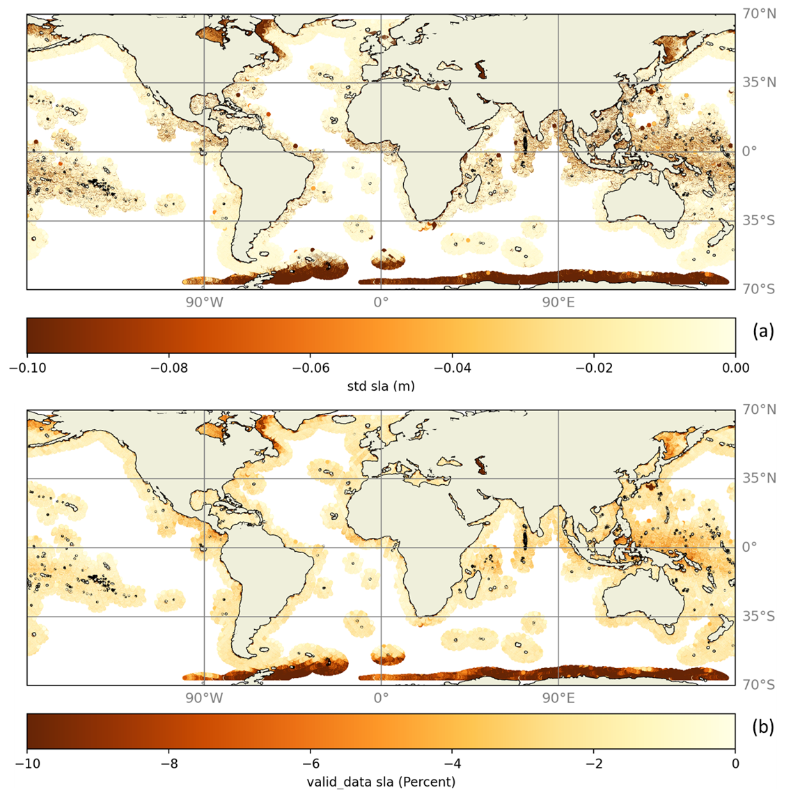 First, we evaluated the impact of the validation flag on the SLA standard deviation (SD) and on the data availability. In practice the latter is measured by the percentage of data with a value in the SLA time series. These diagnostics are represented as a function of the distance to the coast (Fig. 2) and in the form of a map over the whole domain covered by the ALTICAP dataset (Fig. 3). Without the flag, SD values increase sharply within 10 km from the coast, reaching several meters, due to an increasing number of outliers in the SLA as we approach land. The time series remain 80 % complete up to an average of 4.3 km from the coast at global scale. When applying the validation flag, the SD values of the ALTICAP SLAs are strongly reduced in the last 10 km off the coast, from several meters to about 10 cm (see Fig. 5 in the next section for a similar plot with a different vertical range). The amount of edited data in the SLA time series decreases below 80 % up to 8.7 km from the coast in global average. The areas where ALTICAP data are the most edited (Fig. 3b) are the polar regions, which are affected by the seasonal presence of sea ice (e.g., Southern Ocean, Hudson Bay, Canadian coast, Okhotsk Sea, coast of Alaska), and the tropical band (particularly the South-East Asian Seas) that is strongly affected by rain cells.